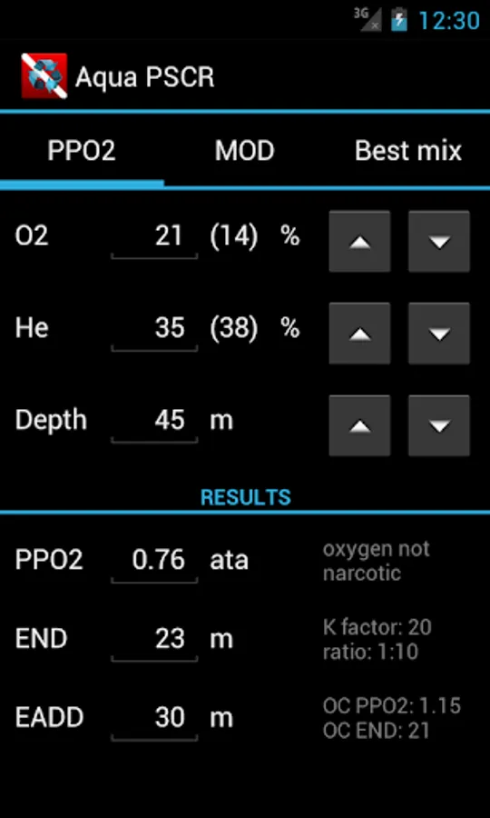 - MOD: maximum operating depth for given mix and PPO2,