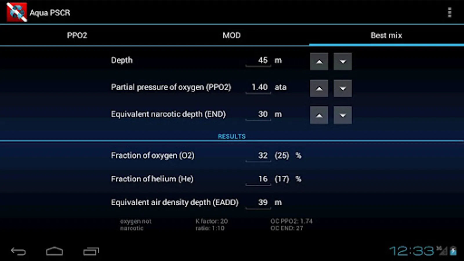 All calcuations take into account oxygen drop specific to given K factor and rebreather ratio. Oxygen drop is calculated using formula:
