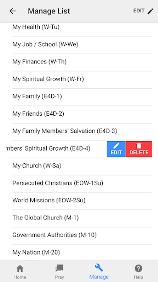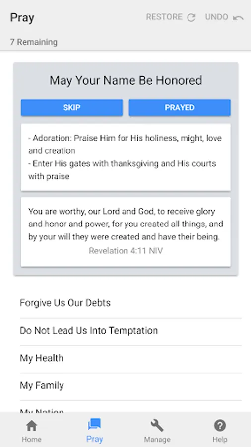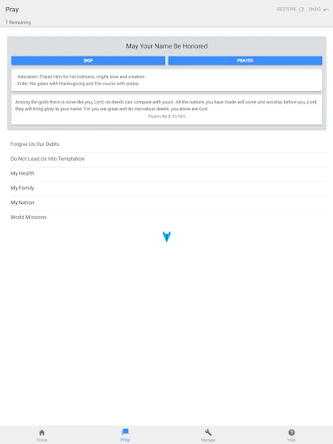 Pray Through comes with a preinstalled list of example requests. You can use this list as is, modify it in any way that suits you or delete it altogether and add your own requests. The example prayer list is based on the Lord’s Prayer (the Model Prayer) from Matthew 6:9-13 where Jesus taught His disciples to pray.