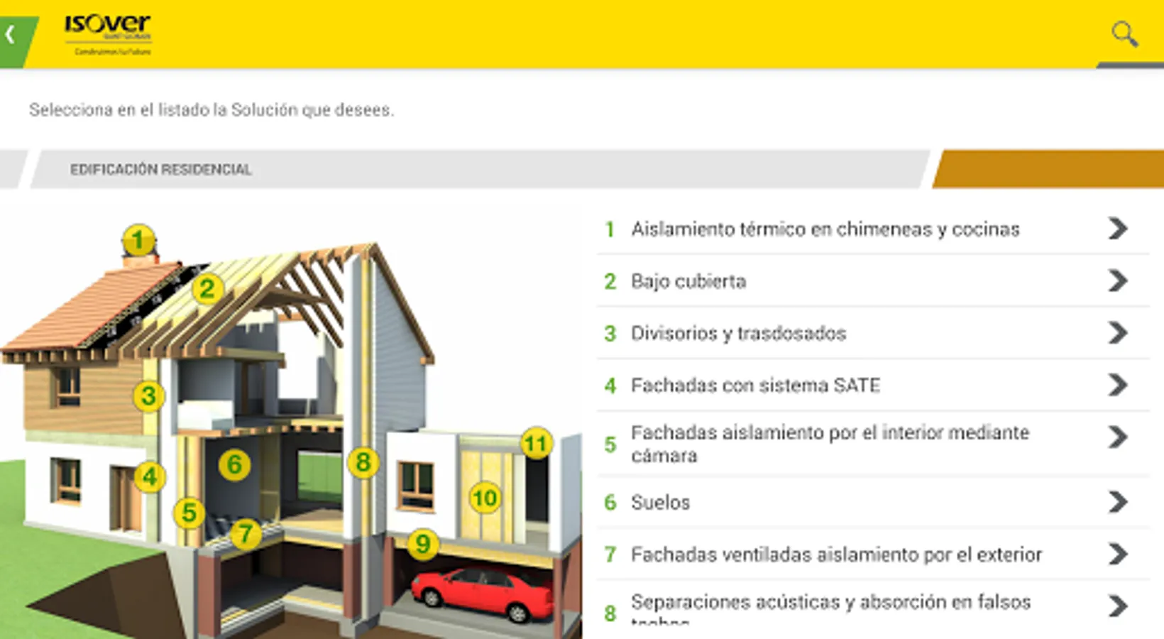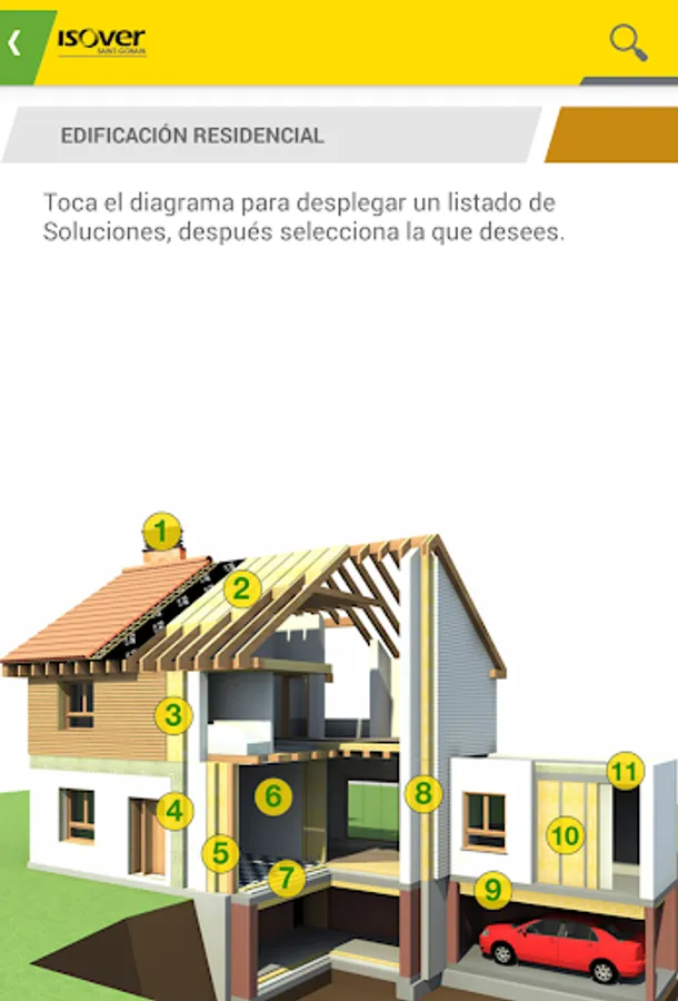 • Choose between insulation solutions and ISOVER products recommended for Residential Building, Industrial Building, Air Conditioning, Industry and Fire Protection applications, either through the list of products or by selecting them in the diagrams corresponding to each application.