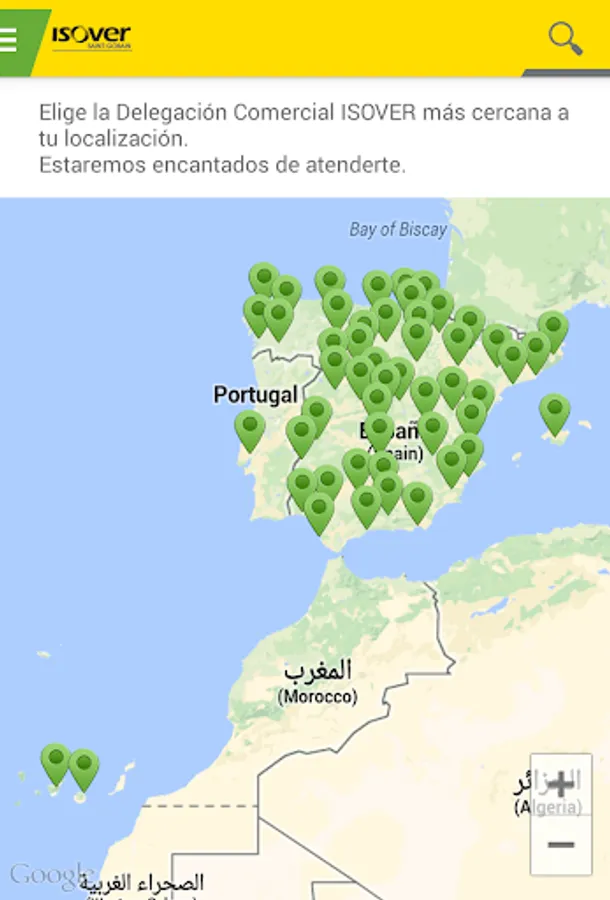 • Easily locate, thanks to the geolocation function, the ISOVER Commercial Delegates closest to you, with whom you can contact both by phone and by email.
