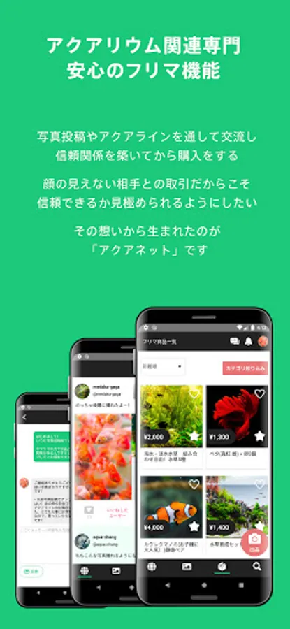 ・ Flea market function that fulfills "want / want to sell" specialized in aquarium-related products such as living organisms, aquatic plants, and aquarium goods