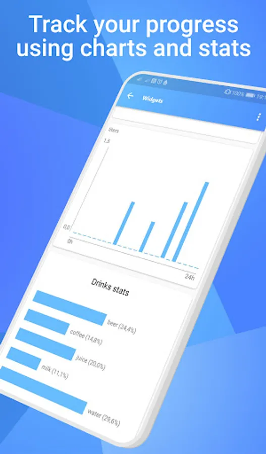 📊 Statistics - Drink Water Reminder app keeps track of your daily water consumption logged using water log system and calculates daily goal progress and long-term statistics of your water balance.