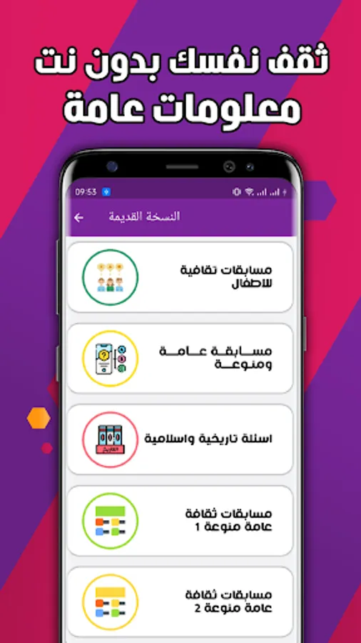 The application aims to spread cultural awareness among people, as it contains general information and 4800 questions and answers through general cultural competitions in all fields, such as Islamic religious competitions and their answer, and test your general culture. Educate yourself with useful information without the Internet that is intended to educate people and increase their scientific awareness