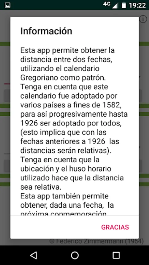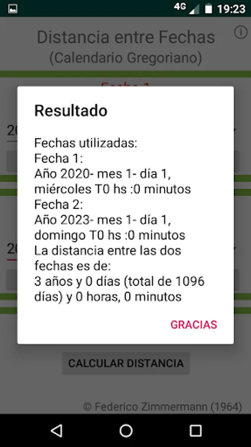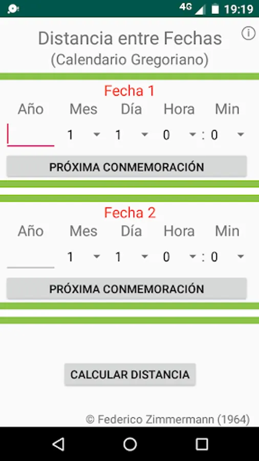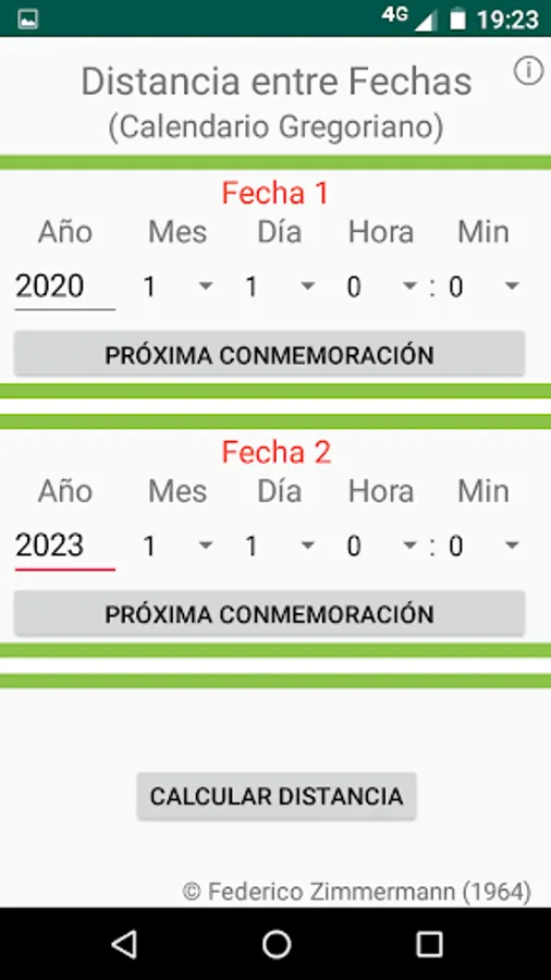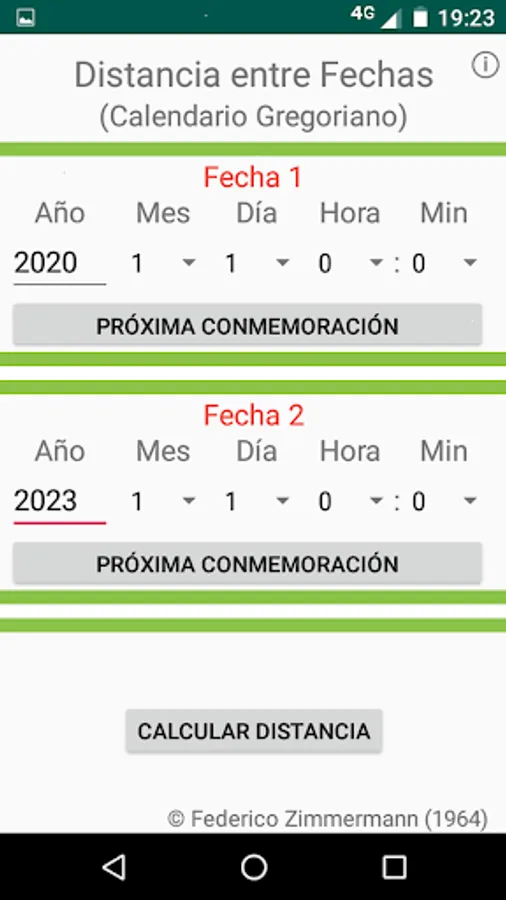 This app allows you to obtain the distance between two dates, using the Gregorian calendar as a pattern.