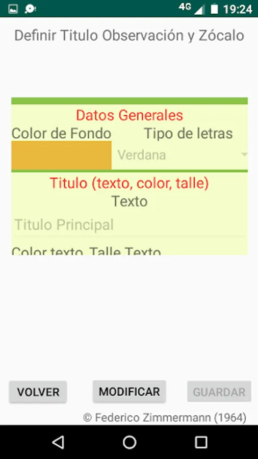 And then complete the data that will be saved in the file, Title, Observation, Zócalo, type of letters, background color, color and size of each text.