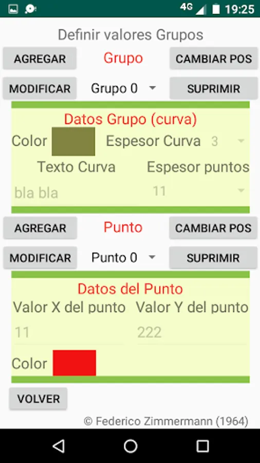 Define the values of the X coordinate and the Y coordinate, varying between numbers and or text, depending on the type of graph chosen, these values are grouped into one or several groups, and for each group I can define the thickness of the curve and or the thickness of the intersection points, and the group text, and then for each group I can add intersection points with their X and Y values, and their color.