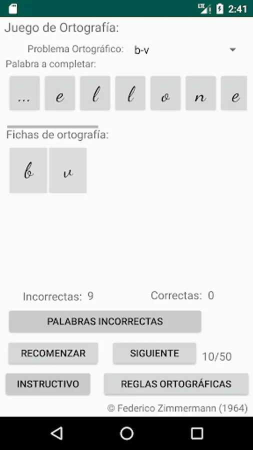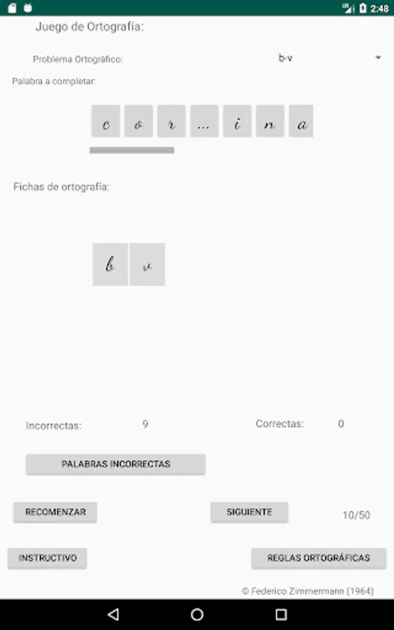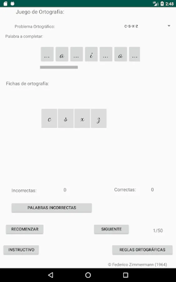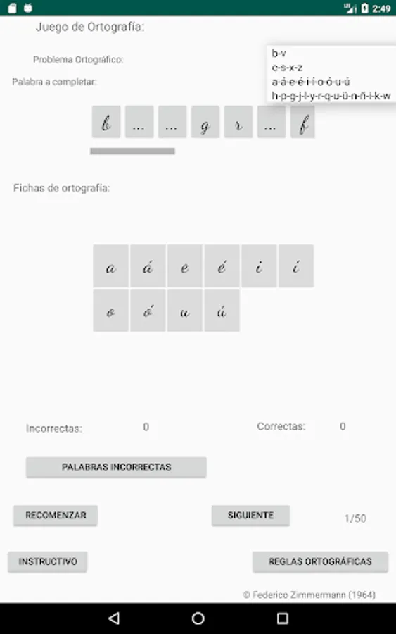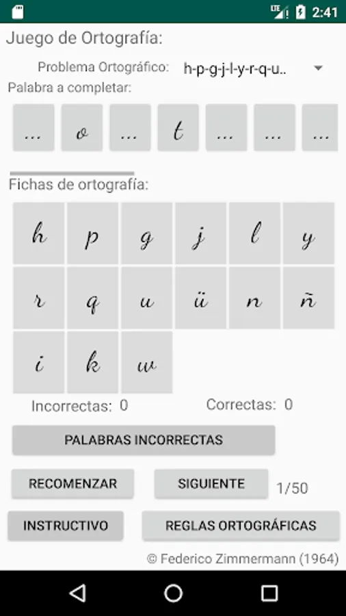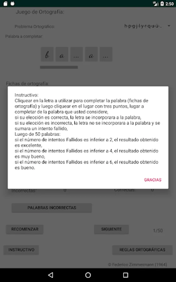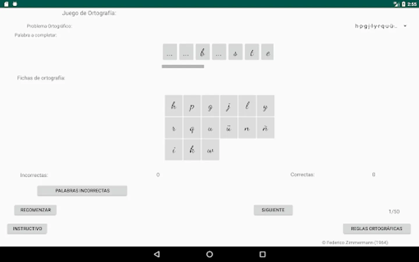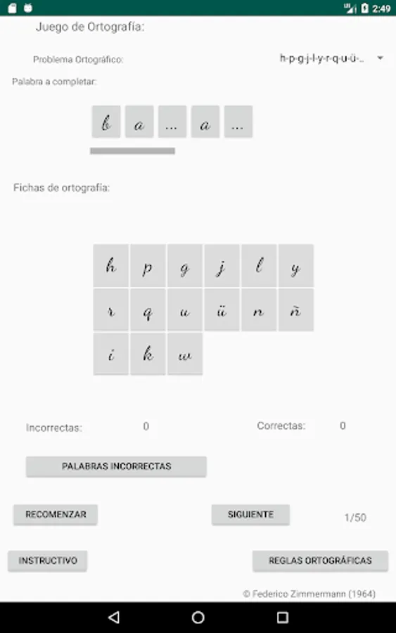 Select the spelling problem you want, click on the letter to use to complete the word (spelling cards) and then click on the place with three dots, place to complete the word you consider, if your choice is correct, the letter will be incorporated into the word, if your choice is incorrect, the letter will not be incorporated into the word and a failed attempt will be added, move on to the next word (50 words are selected to complete each restart).