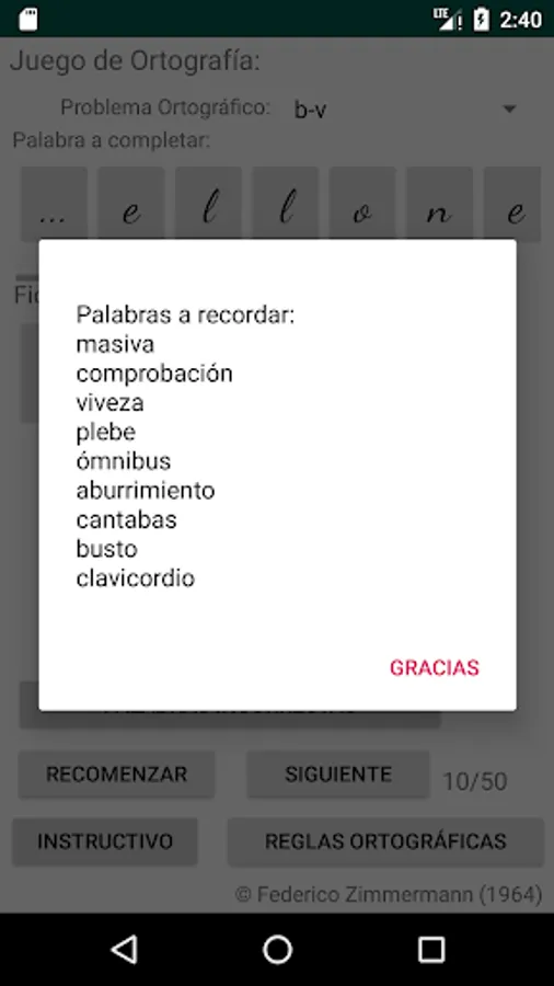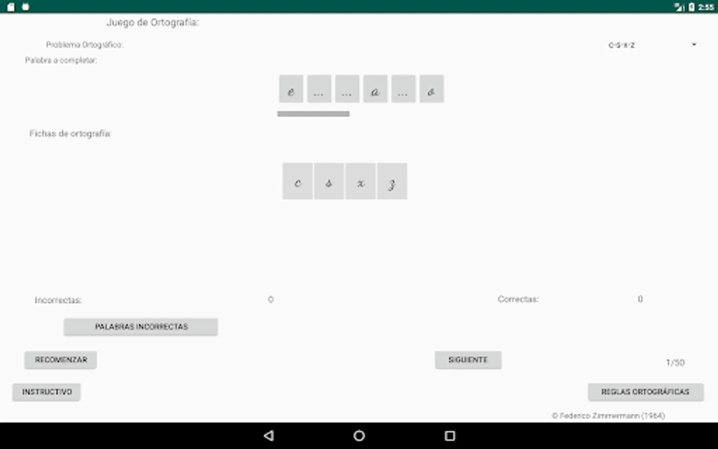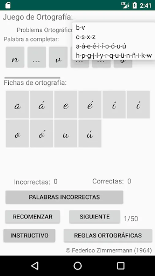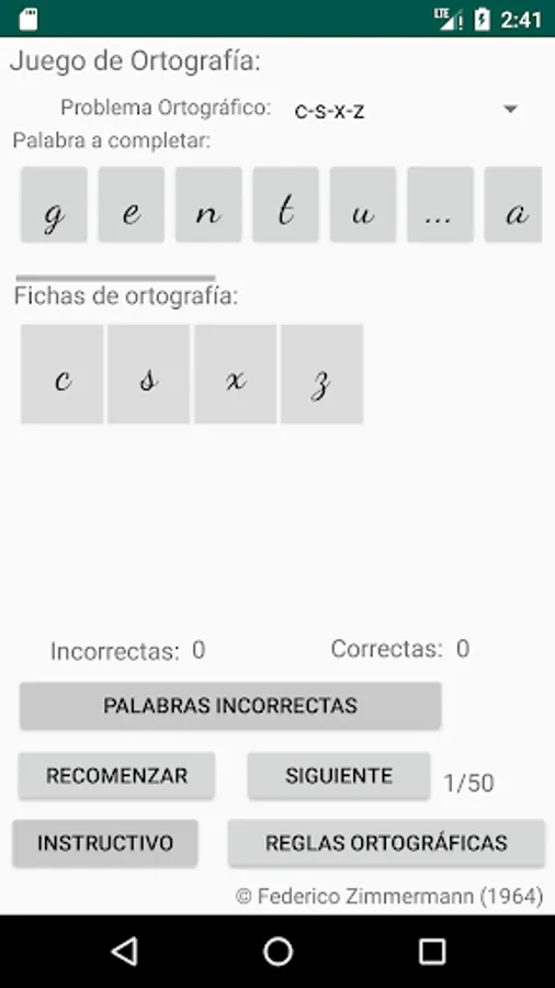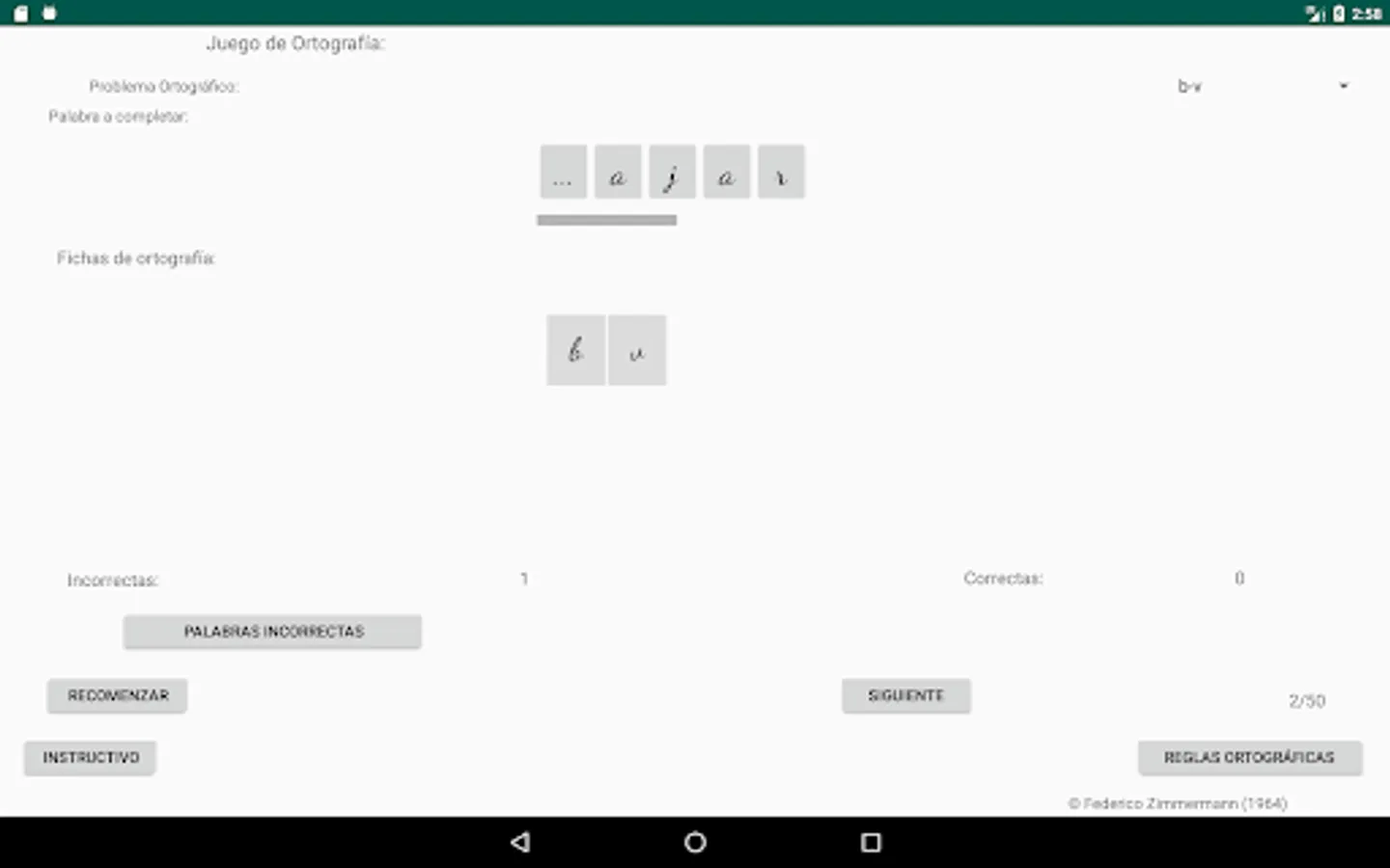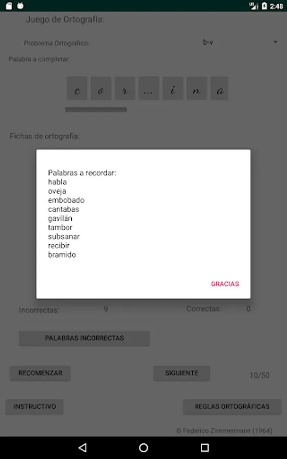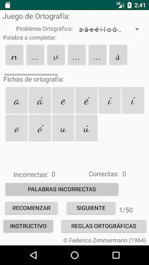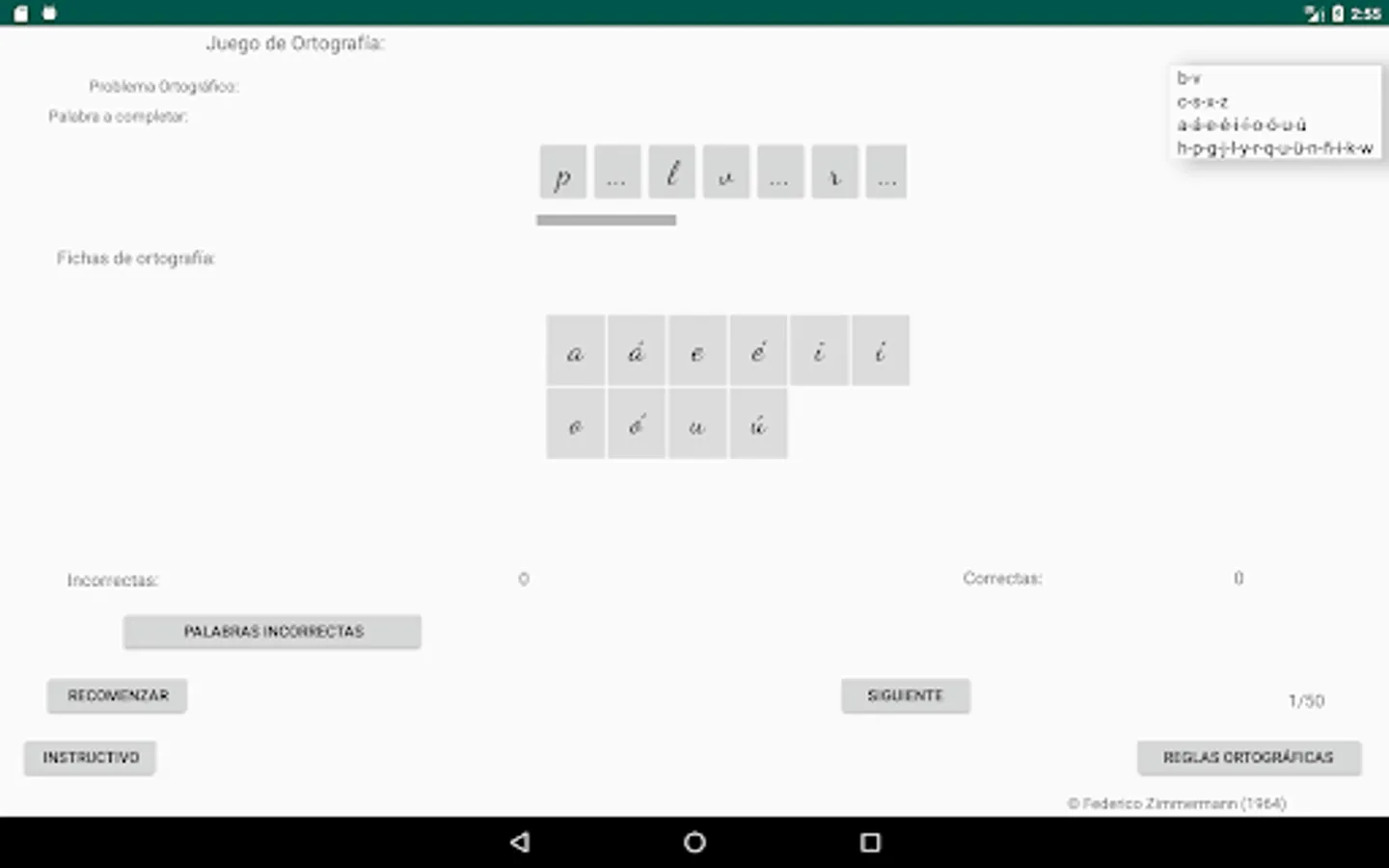 Select the spelling problem you want, click on the letter to use to complete the word (spelling cards) and then click on the place with three dots, place to complete the word you consider, if your choice is correct, the letter will be incorporated into the word, if your choice is incorrect, the letter will not be incorporated into the word and a failed attempt will be added, move on to the next word (50 words are selected to complete each restart).