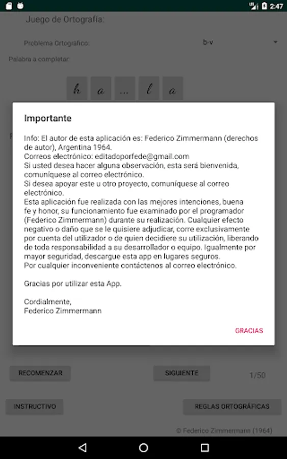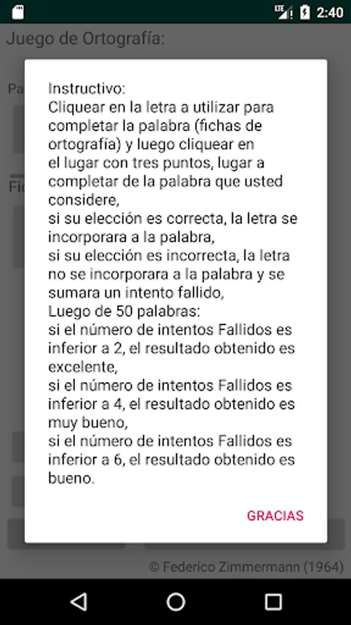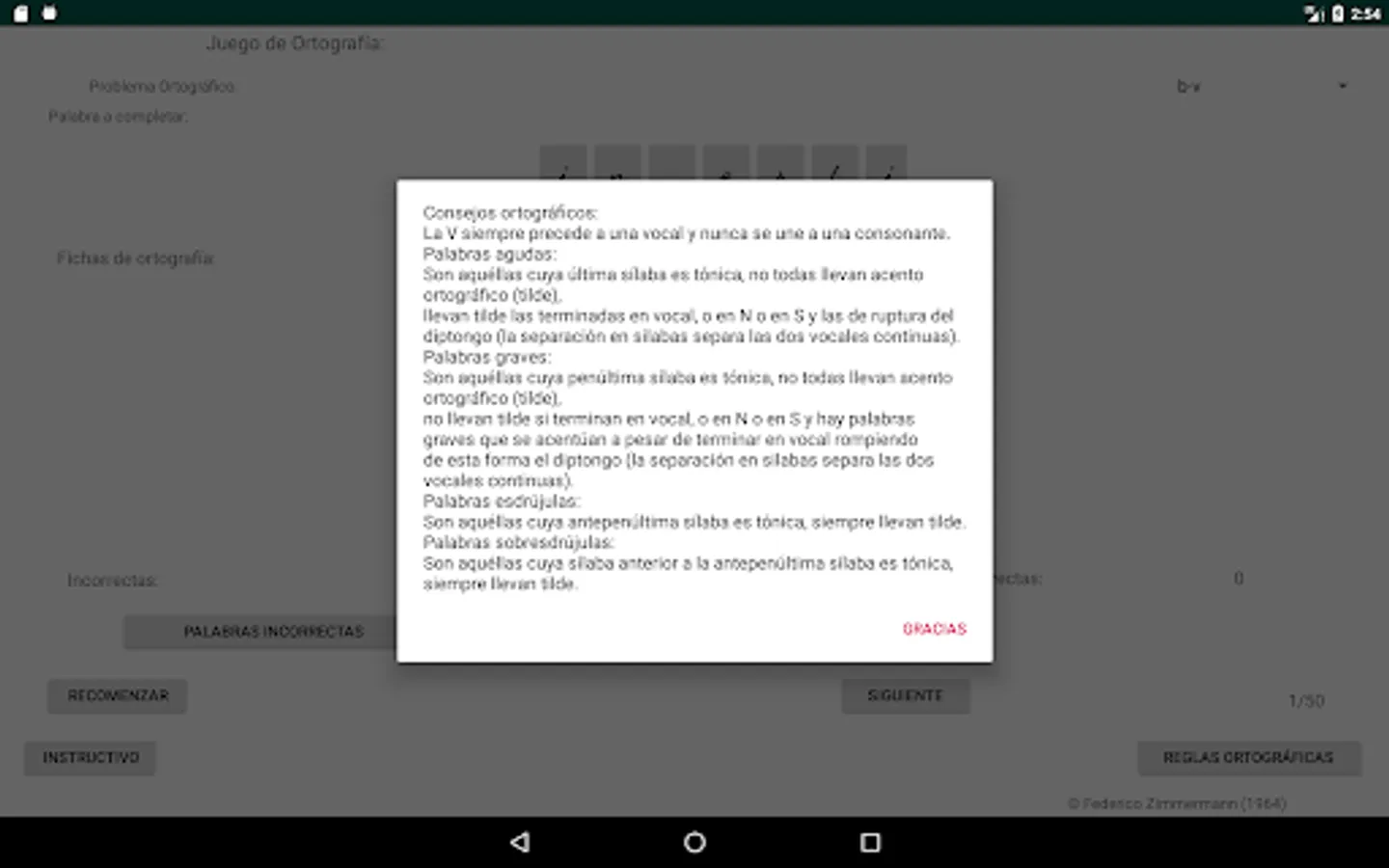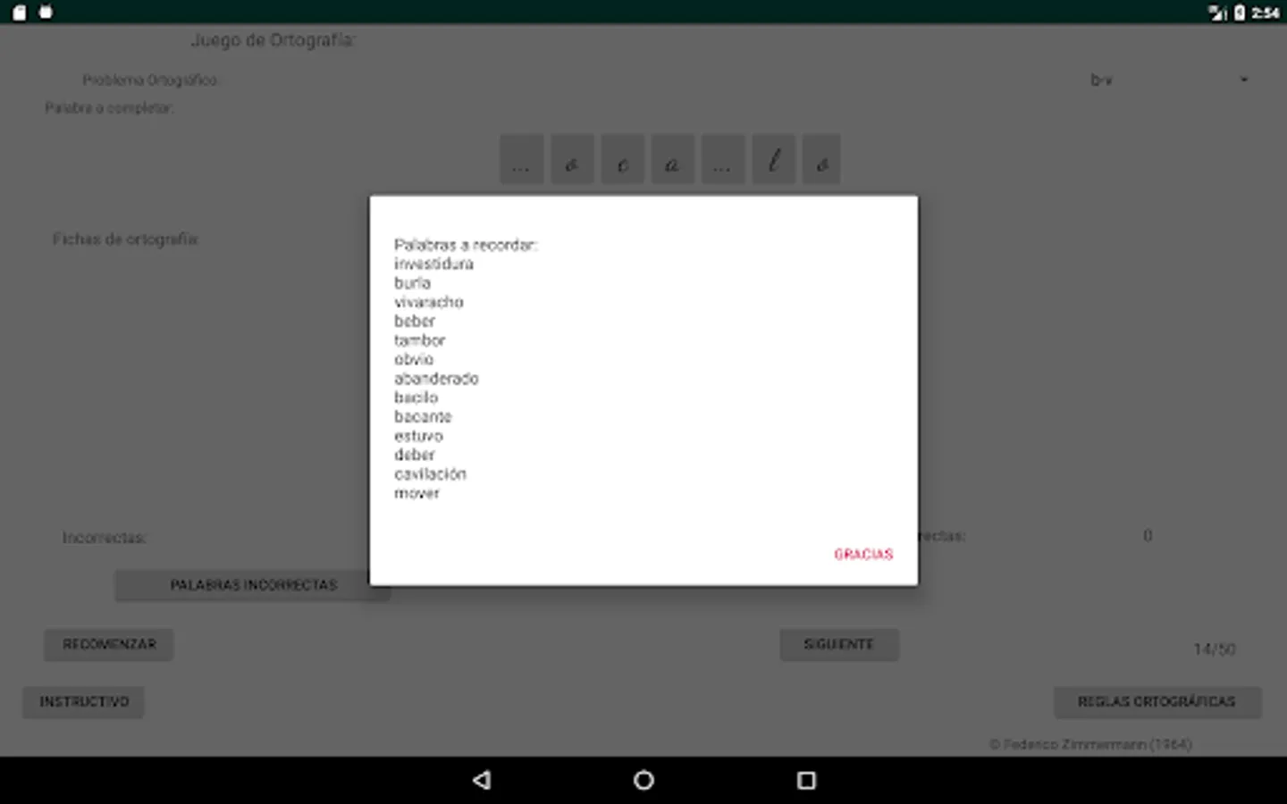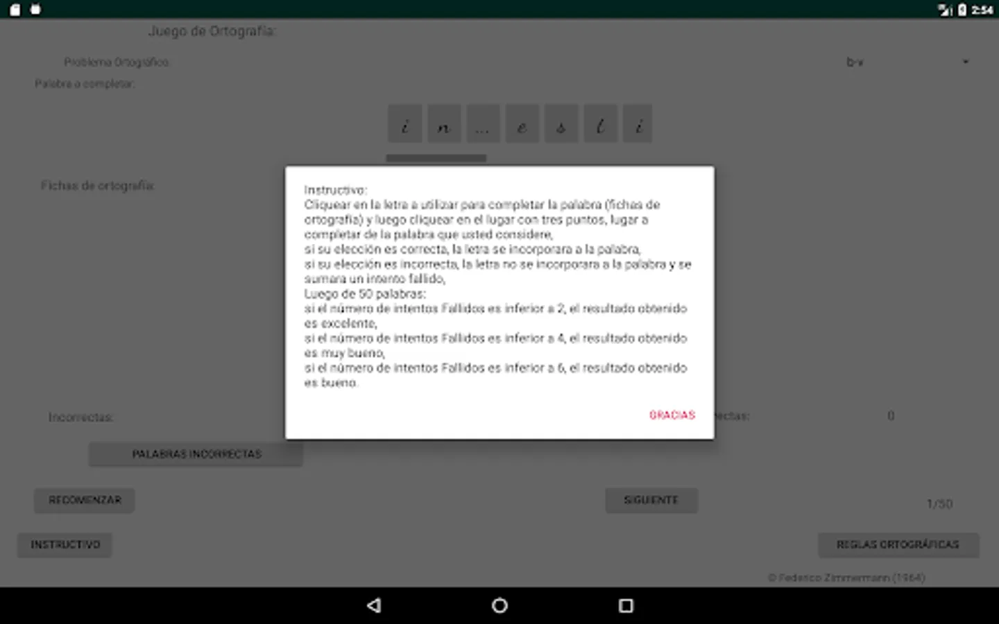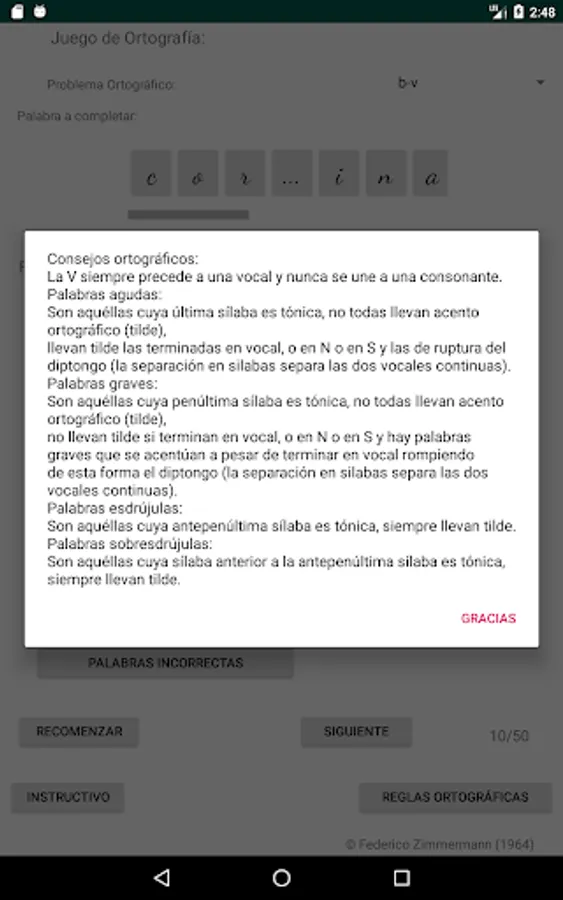 Select the spelling problem you want, click on the letter to use to complete the word (spelling cards) and then click on the place with three dots, place to complete the word you consider, if your choice is correct, the letter will be incorporated into the word, if your choice is incorrect, the letter will not be incorporated into the word and a failed attempt will be added, move on to the next word (50 words are selected to complete each restart).