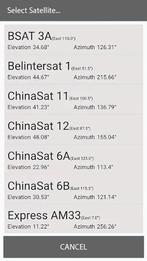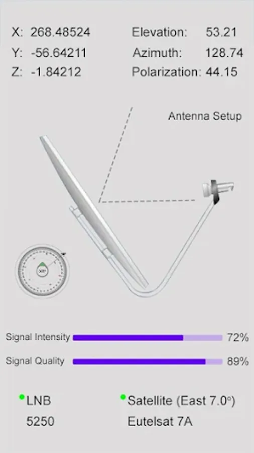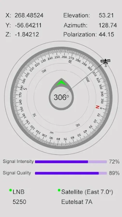 In this application you can select any satellite in this app like Al Yah 1, Amos 3, Amos 4, Amos 7, Apstar 4, Apstar 6, Apstar 7, Apstar 9, Arabsat 2B, Arabsat 5A, Arabsat 5C, Asiasat, Asiasat 4, Asiasat 7, Hellas Sat 2, Hellas Sat 3, Horizons 2, Hot Bird 13A, Hot Bird 13B/C/E, Insat 4A, Intelsat 10-02, Intelsat 12, Intelsat 15, Intelsat 20, Intelsat 22, Intelsat 28, Intelsat 29e, Intelsat 33e, Intelsat 36, Intelsat 902, Intelsat 904, Intelsat 906, G-SAT 15, G-SAT 16, G-SAT 8, JcsAT 4B, Ka-Sat 9A, KazSat 2, KazSat 3, Koreasat 5, Koreasat 6/7, LaoSat 1, Measat 3/3b/3a, Measat 3a, MonacoSat, N-Sat 110, NSS 12, NSS 5, NSS 6, NigComSat 1R, Thaicom 5/6/8, Thaicom 7, Thor 3/5/6/7, Thor 7, TurkmenAlem, Turksat, 3A/4A, Vinasat 1/2, Yamal 202, Yamal 401, Yamal 402, Paksat 1R, Papala D, Rascom QAF 1R, SES 5, SES 7/9, SES 8, ST 2, Superbird C2, Telestar 18, Telkom 1, Telkom 3S, Asiasat 6, Asiastar, Astar 19.2E, Astra 1D/H/kr?L/M, Astra 1G/5B, Astar 2A/B/C/D/F/G, Astra 3A/B/1E, Astra 4A, Azerspace 1, BADR-3, BADR-4/5/6/7, BSAT 3A, Belintersat 1, Es’hail 1, Eutelsat 10A, Eutelsat 16A/B/C, Eutelsat 21B, Eutelsat 25B, Eutelsat 33C, Euletsat 36B, Euletsat 3B, Eutelsat 5 West A, Eutelsat 7A, Eutelsat 8 West C, Eutelsat 9B, Eutelsat Telecom 2D, Express AM33, Express AM5, Express AM6, Express AM7, Express AMU1, Express AT1, Express AT2, G-SAT 10, G-SAT 17, Thaicom, Thaicom 4. Satfinder (satellite director) with gyro compass app is a tool that will help you to find the tv satellite and set up a satellite dish with gyro compass and clinometer or bubble level meter. It will give you LNB azimuth elevation and it will show you right longitude and latitude on your screen.