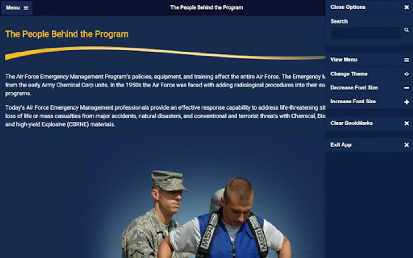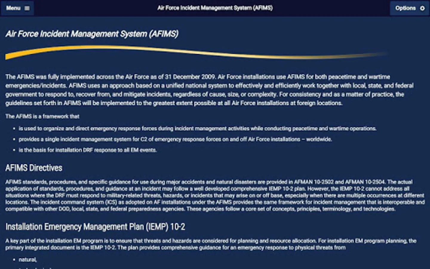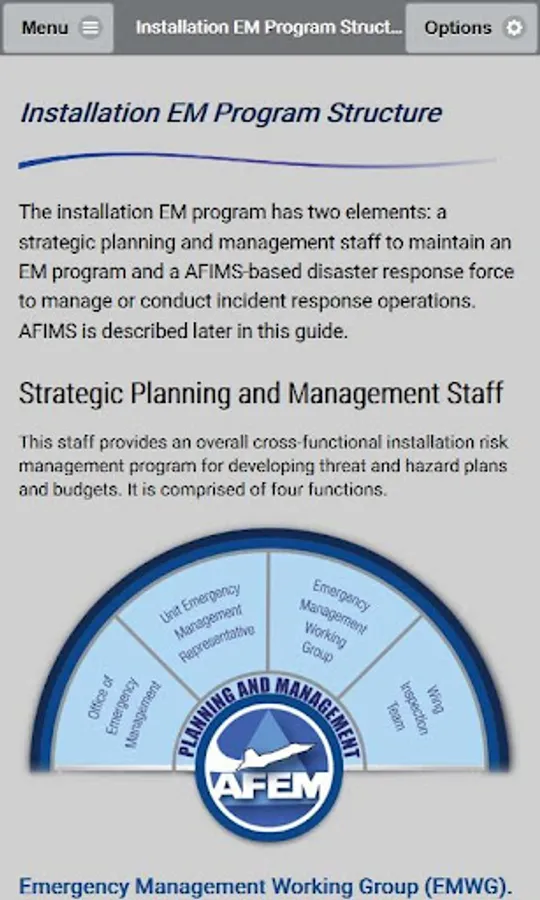 This digital version of the Air Force EM Program Senior Leader Guide is intended to familiarize and assist Air Force senior leaders with implementing the Air Force EM program at the installation level. This guide identifies how members of the installation and the Civil Engineer Squadron’s Readiness and Emergency Management Flight support the Air Force EM program across all levels of the installation.
