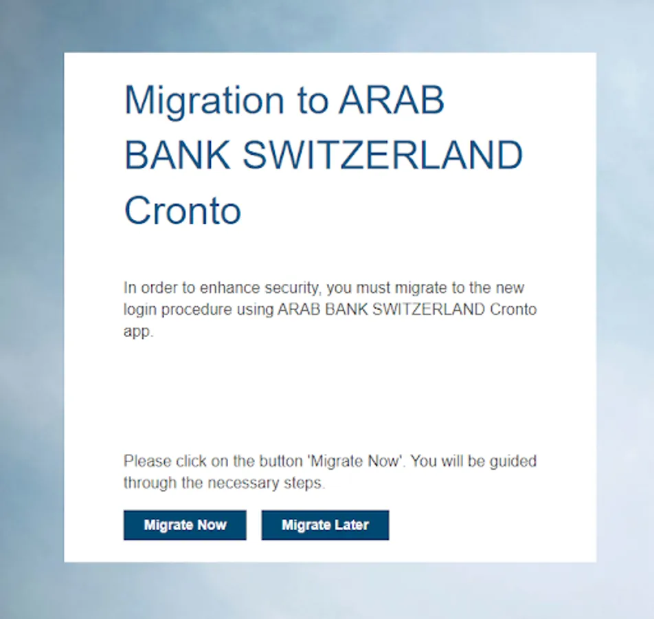 Use your smartphone camera to instantly scan a graphical cryptogram on the PC screen and follow the instructions to login into Arab Bank Switzerland e-banking site in the best secure way