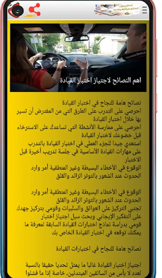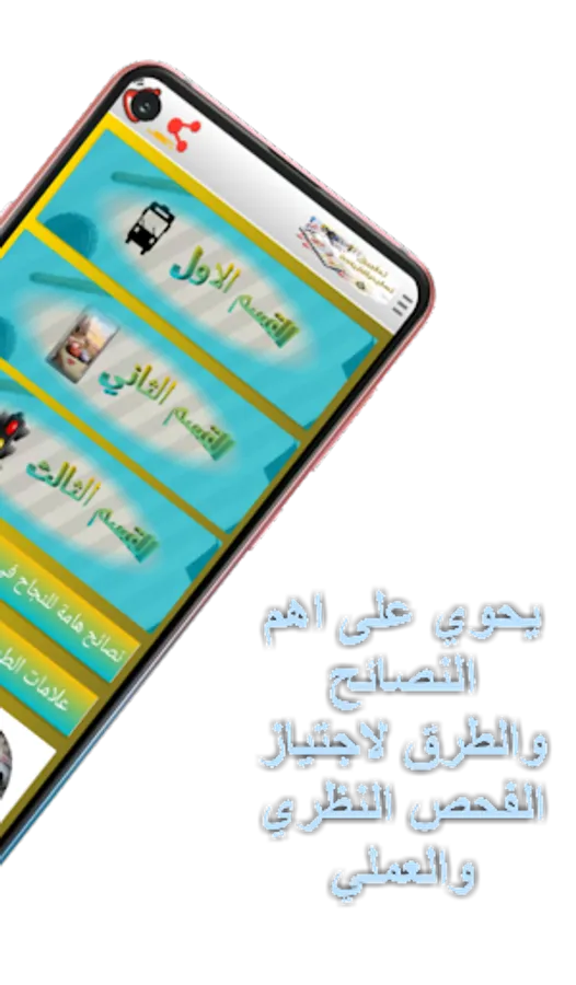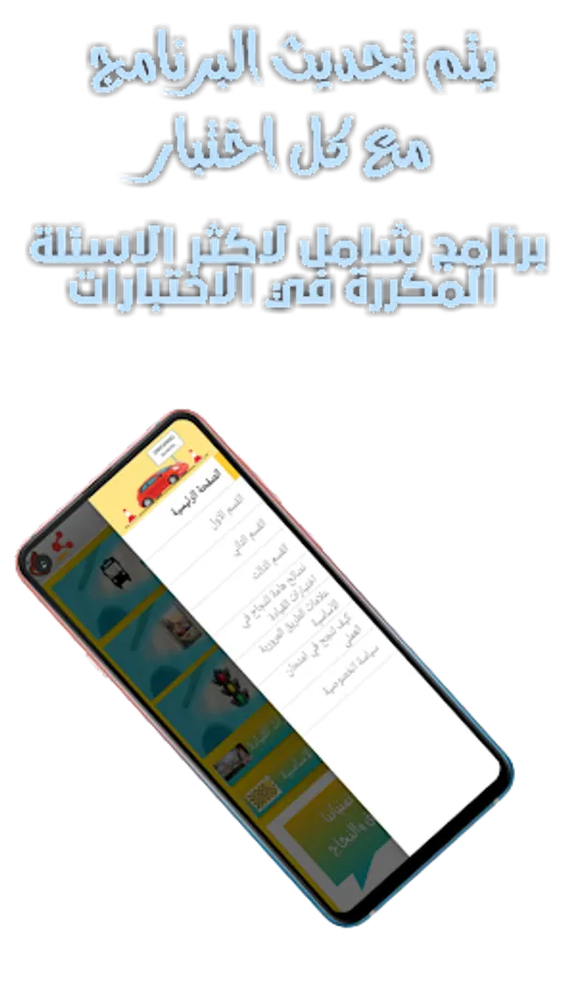 Driving a car Theoretical examination A program of tests and questions supported by pictures similar to the theoretical examination for driving a car and contains the same time period and the same method and indicates the correct answer and gives a result at the end of each test. It was established by specialists and professors in this field, and it is subject to updating with each new course of leadership. Driving a car Theoretical examination A program of tests and questions supported by pictures similar to the theoretical examination for driving a car and contains the same time period and the same method and indicates the correct answer and gives a result at the end of each test. It was created by specialists and professors in this field, and it can be updated with each new driving course