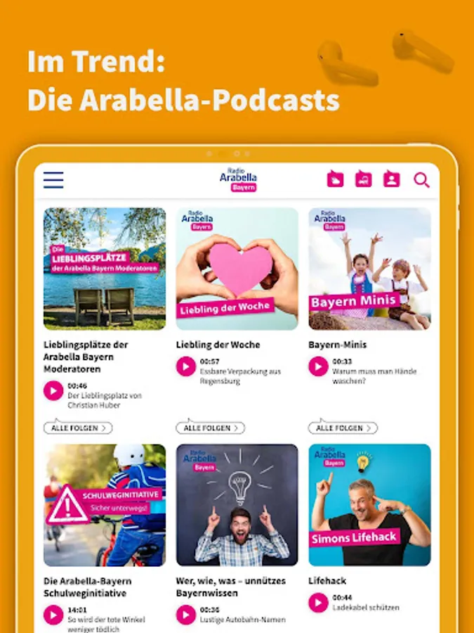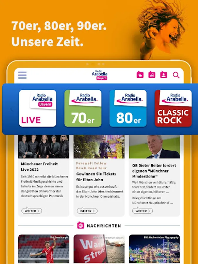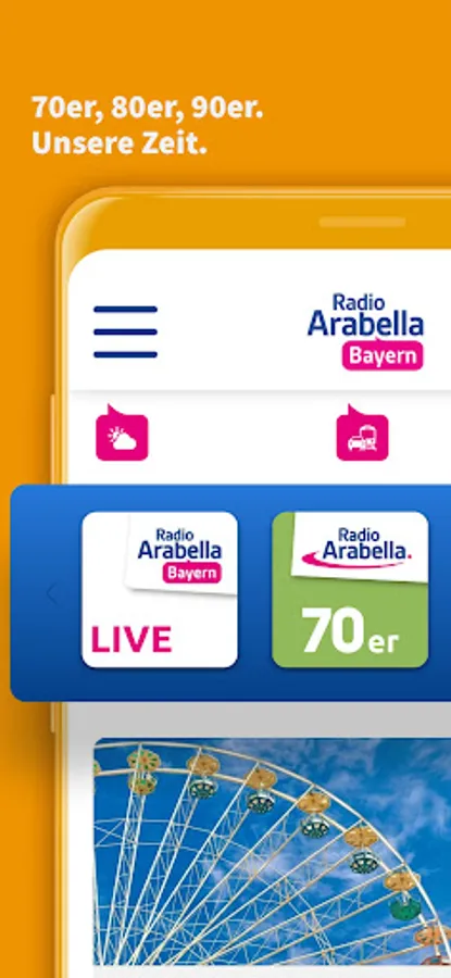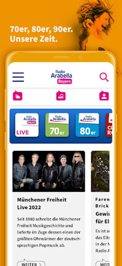 With the new Arabella Bayern app you always have your favorite station at hand: "70s, 80s, 90s. Our time”: Listen to the Arabella Bayern live program as a web stream whenever and wherever you want. At home, in the office, on the road or as a soundtrack for the barbecue party. One click is enough.