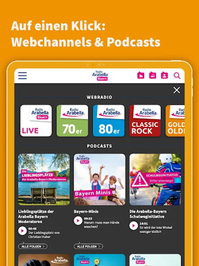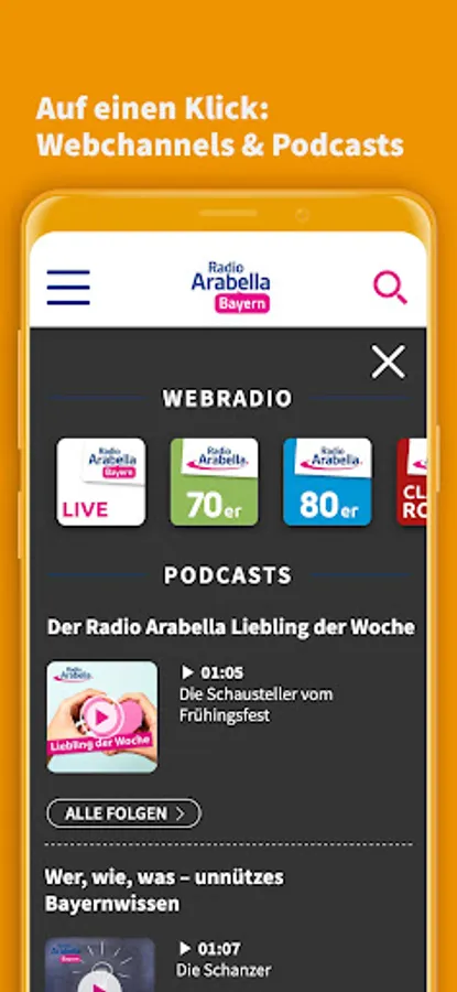 Would like more? Then select one of our many other Arabella Bayern web channels from the 70s, 80s, 90s, golden oldies, classic rock to Latino, Schlager, Oktoberfest or Christmas radio under "More Arabella" in the new audio library. With the new, convenient player function, you can start, pause or change web radio streams at any time.