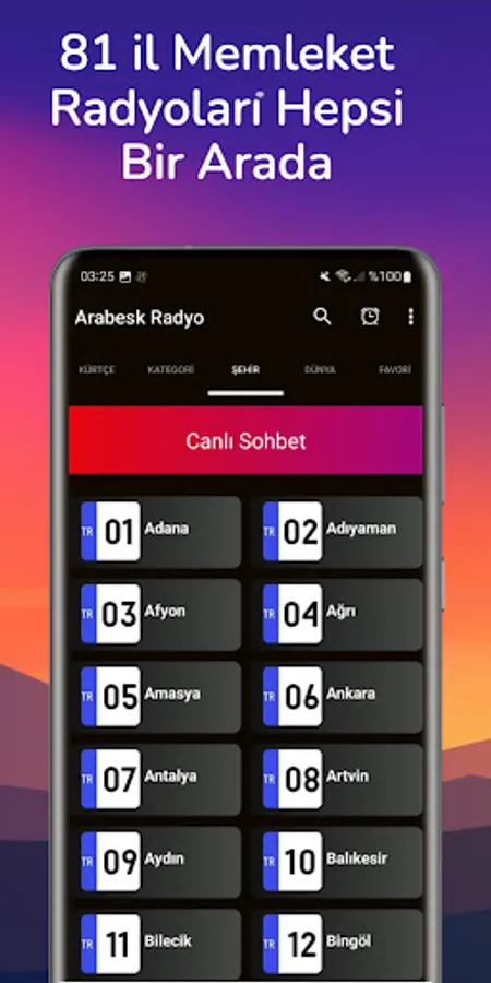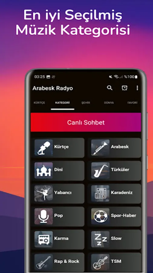 You can listen to other radios in our application if you want. Our other Live Radio categories in our application are; Arabesk Radio, Türkü Radio, Religious Radio, Pop Radio, Foreign Radio, Turkish Art Music, Rock Music, Rap Music, Jazz Music, Kurdish Radio, Kurdish Music, Sports Radio, News Radio, 81 Province Radios, World Radios and Mixed Radios. You can listen together.