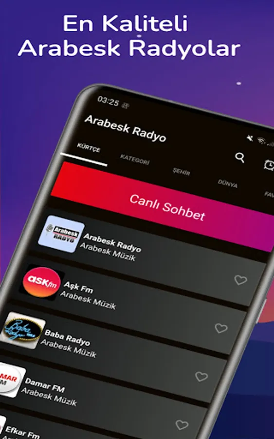 You can listen to Damar songs, Arabesque Radios, Arabesk Radio, Damar FM, Arabesk Türk, Arabesk FM, Ekfarlı Radios, Kral FM Damar and many other categories in our Live Radio application.