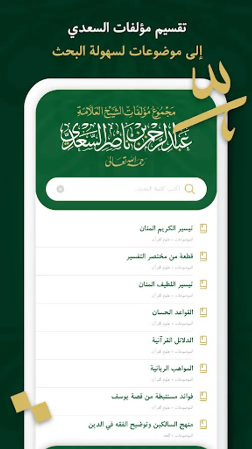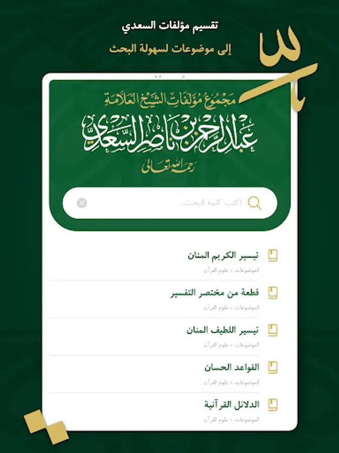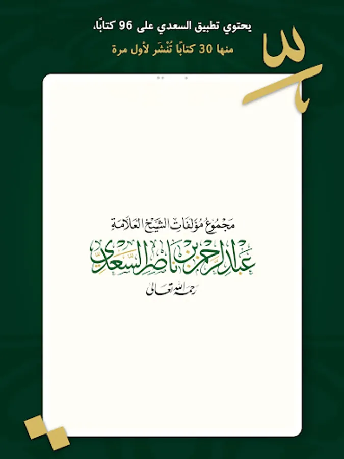 تطبيق مؤلفات السعدي .. مجموعة مؤلفات الشيخ العلامة عبد الرحمن بن ناصر السعدي – رحمه الله – يتضمن مجموع مؤلفات الشيخ السعدي في موضوعات علوم القرآن الكريم، وأشهرها تفسيره «تيسير الكريم الرحمن في تفسير كلام المنان» والمشهور بـ«تفسير السعدي»، كما يضم التطبيق مؤلفات الشيخ السعدي في الحديث الشريف، والفقه، والعقائد، والآداب الشرعية، والأخلاق في الإسلام، والفتاوى الشرعية، وما قدَّمه الشيخ في حياته؛ من دروس في الفقه المقارن، ومراسلات، ومقالات، بالإضافة إلى الخطب والمؤلفات في الفقه وأصوله.
