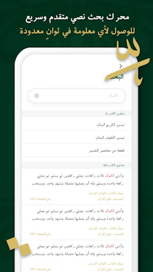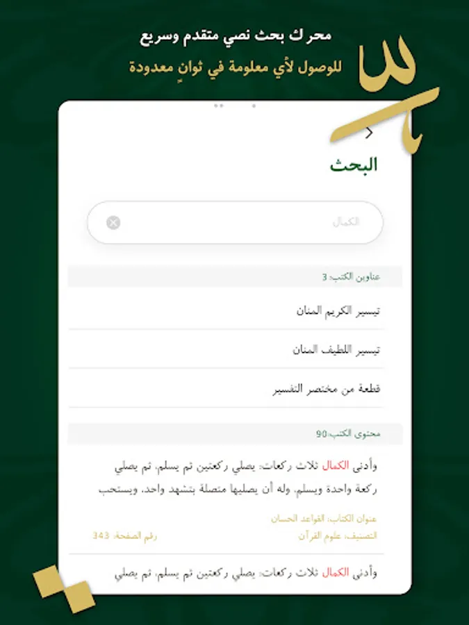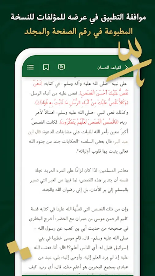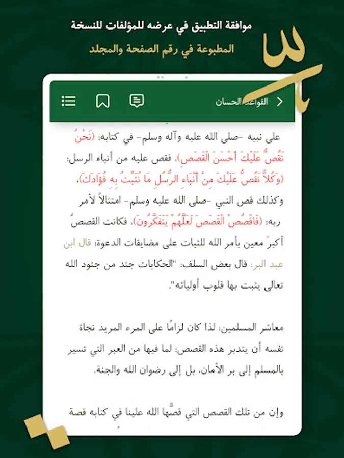موافقة التطبيق في عرضه للمؤلفات للنسخة المطبوعة في رقم الصفحة والمجلد لمساعدة طالب العلم والباحثين في أغراض التوثيق العلمي.