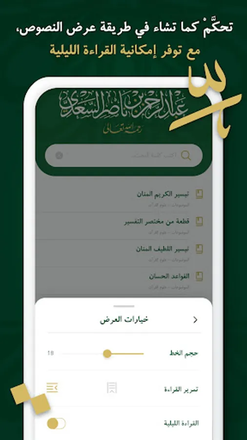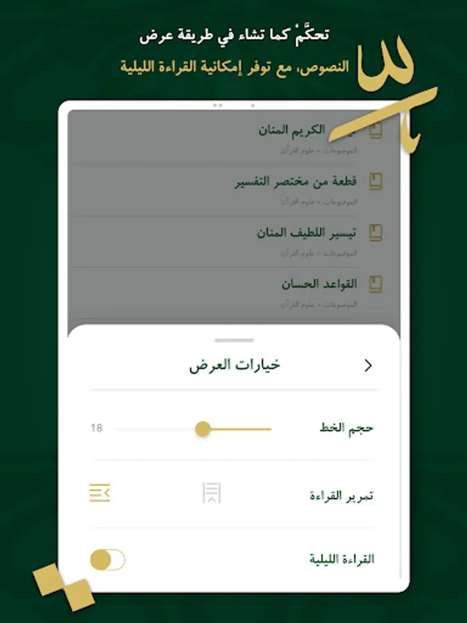تحكَّمْ كما تشاء في طريقة عرض النصوص، فبإمكانك تغيير نوع الخط ولونه وحجمه، وكذلك لون الخلفية وإمكانية القراءة بالنمط الليلي.