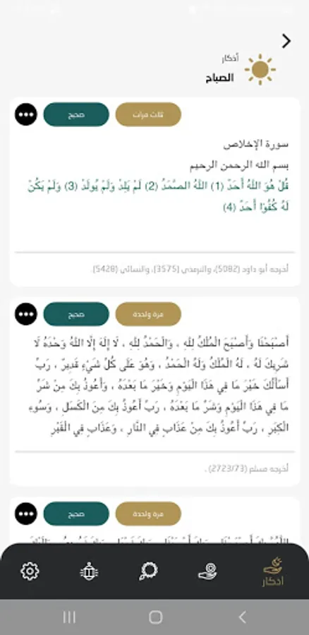 • أذكار الصباح والمساء... أذكار اليوم والليلة .. الطهارة، الخروج والدخول، السفر، الزواج، المجالس، ما يتعلق بالنعم، النفس، التوحيد، أسماء الله الحسنى...