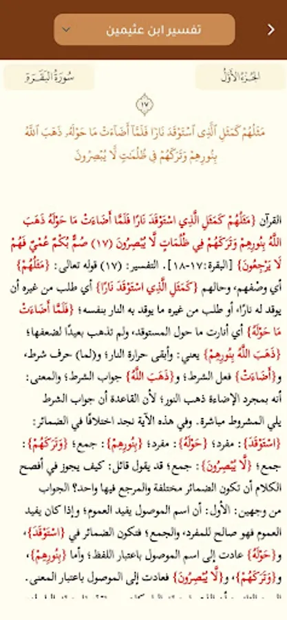 • The ability to access the interpretation of Sheikh Ibn Uthaymeen by clicking on the verse while reading.