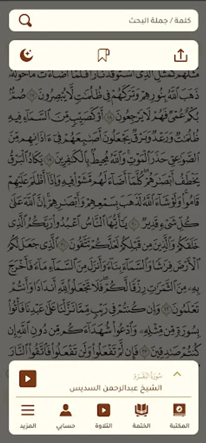 • Super search at the level of the surah, the part and the page number, and the intelligent partial search for a word from a verse.