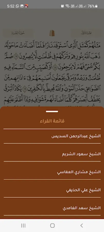 • Recitation service in the voices of the sheikhs: Abdul Basit Abdul Samad, Abdul Rahman Al Sudais, Saud Al Shuraim, Ali Al Hudaifi, with the possibility of re-hearing a verse or a number of verses more than once, including the introduction and delay for the purpose of memorization.