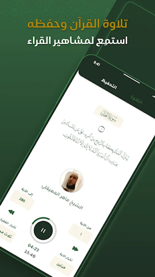 يمكِّنك التطبيق من الاستماع إلى القرآن الكريم بأصوات أشهر القراء.