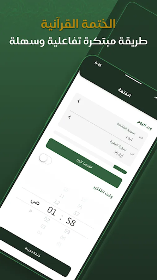 هذه الخدمة تقدِّم لك خيارات متعدِّدة لختمة القرآن الكريم، منها: تحديد مدة الختمة التي ترغب فيها، واقتراح مقدار الورد اليومي، والتذكير بوقت الورد الذي تحدده.