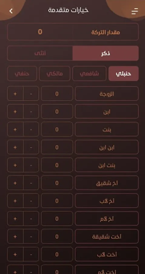 حل مسائل المواريث بالمذاهب الأربعة : الحنبلي - المالكي - الشافعي - الحنفي .