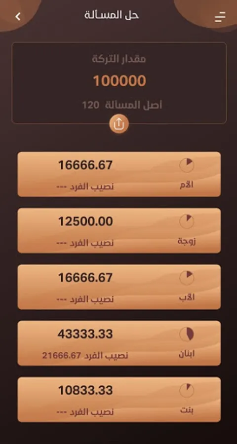 فكل ما عليك أن تقوم بإدخال البيانات الصحيحة، ويضغط على زر الحل، وستظهر لك نتيجة المسألة، مع تحليلها، مبينًا نصيب كل وارث على حدة، ونسبة هذا النصيب من التركة.