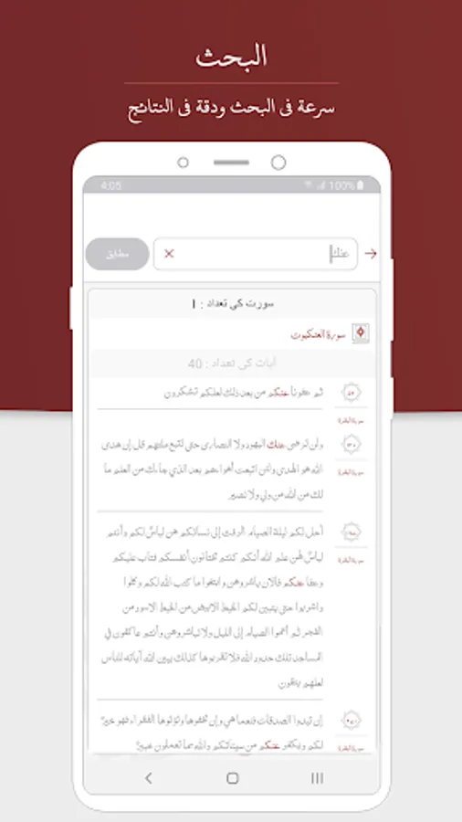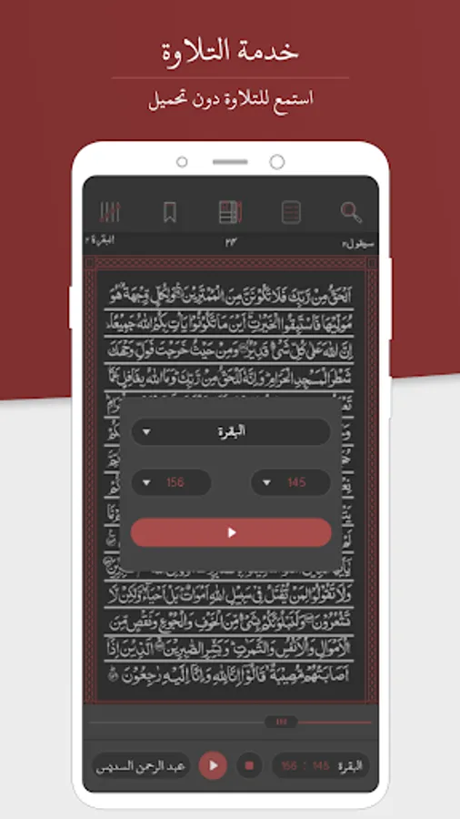Listen to the verses of the Koran through the Internet without downloading, linking the recitation with the verses of the Koran verse verse to facilitate follow-up, with the possibility of defining a specific range of recitation.