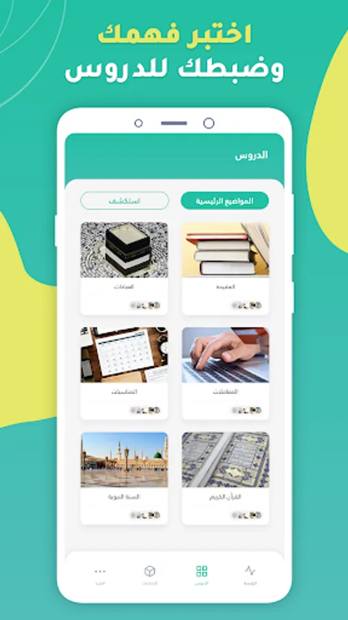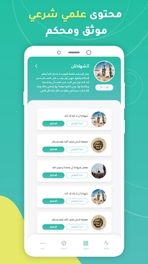 -العقيدة: (الشهادتان، الإيمان بوجود الله، توحيد الربوبية، توحيد الألوهية، توحيد الأسماء والصفات...).