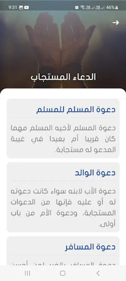 • Categories of Supplication: The application provides general information on supplications including times commendable for supplication, manners and conditions of Supplication, as well as prohibited Supplication.