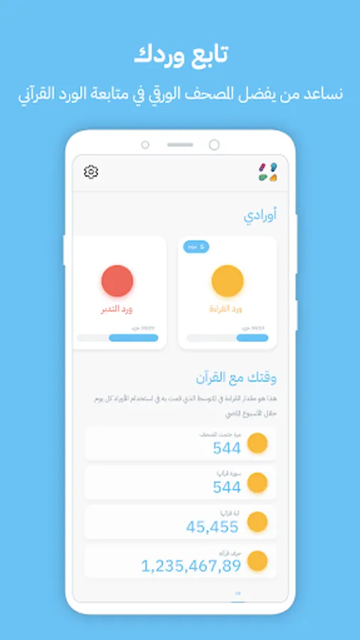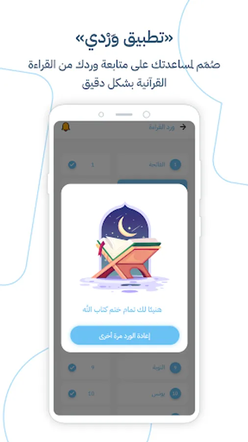 تطبيق وِردي, تابع ختمتك في المسجد, البيت, العمل, غرف الانتظار, مع المصحف الورقي أو تطبيقك المفضل. حمّل #وِردي وتابع وردك.