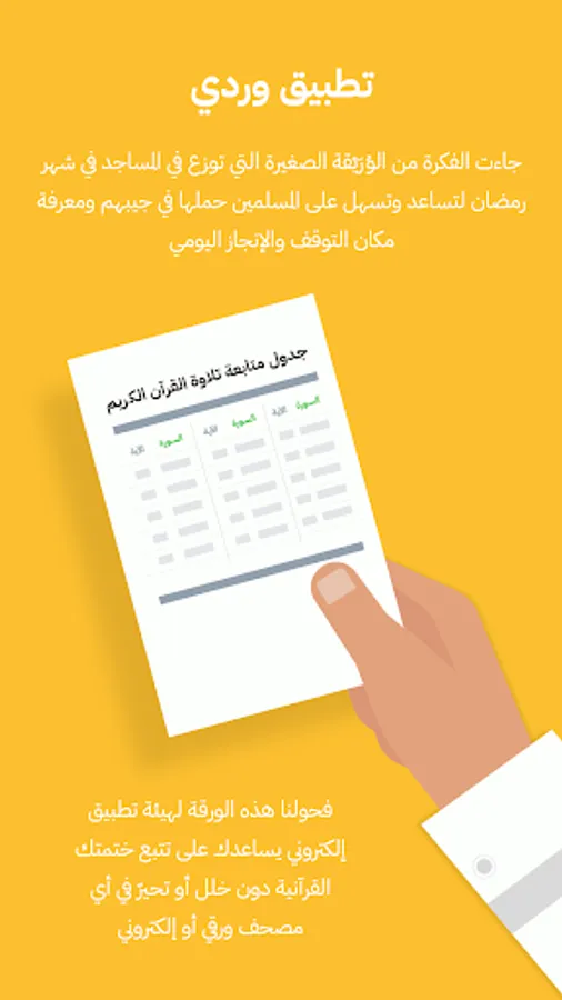 ببساطة, قمنا بأخذ جدول الورد القرآني -المعتاد قديما عند القرّاء- المحمول في الجيب لمتابعة مكان التوقف والإنجاز اليومي, ثم حولنا هذا الجدول إلى تطبيق إلكتروني يساعدك على متابعة ختمتك دون الحاجة إلى التحول عن المصحف الورقي.