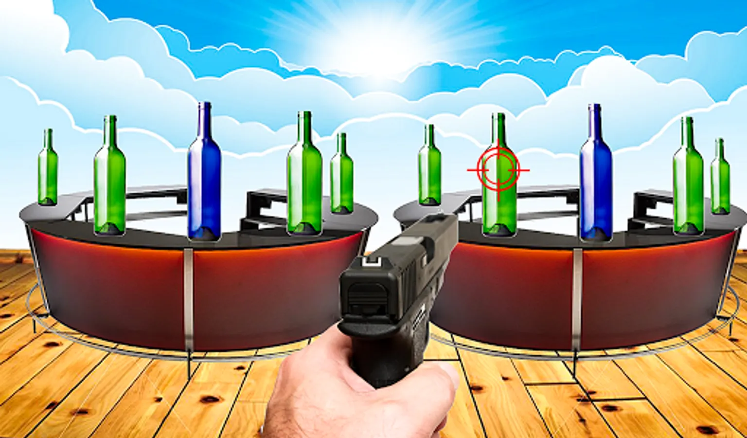 To begin with, you will have to choose the gun you want to start this 3d target bottle shooting. Ultimate gun Bottle Shooting. Load the real army training gun and start firing to smash bottles in this game. Consider yourself as the best sharpshooter of 3d bottle shooting games, hold your real pistol in your hand and pull the trigger. Make sure to aim to take a head shot in bottle breaking game and try to earn combos in bottle 3D games. More broken bottles will help you earn points to increase your high score in bottle championship.