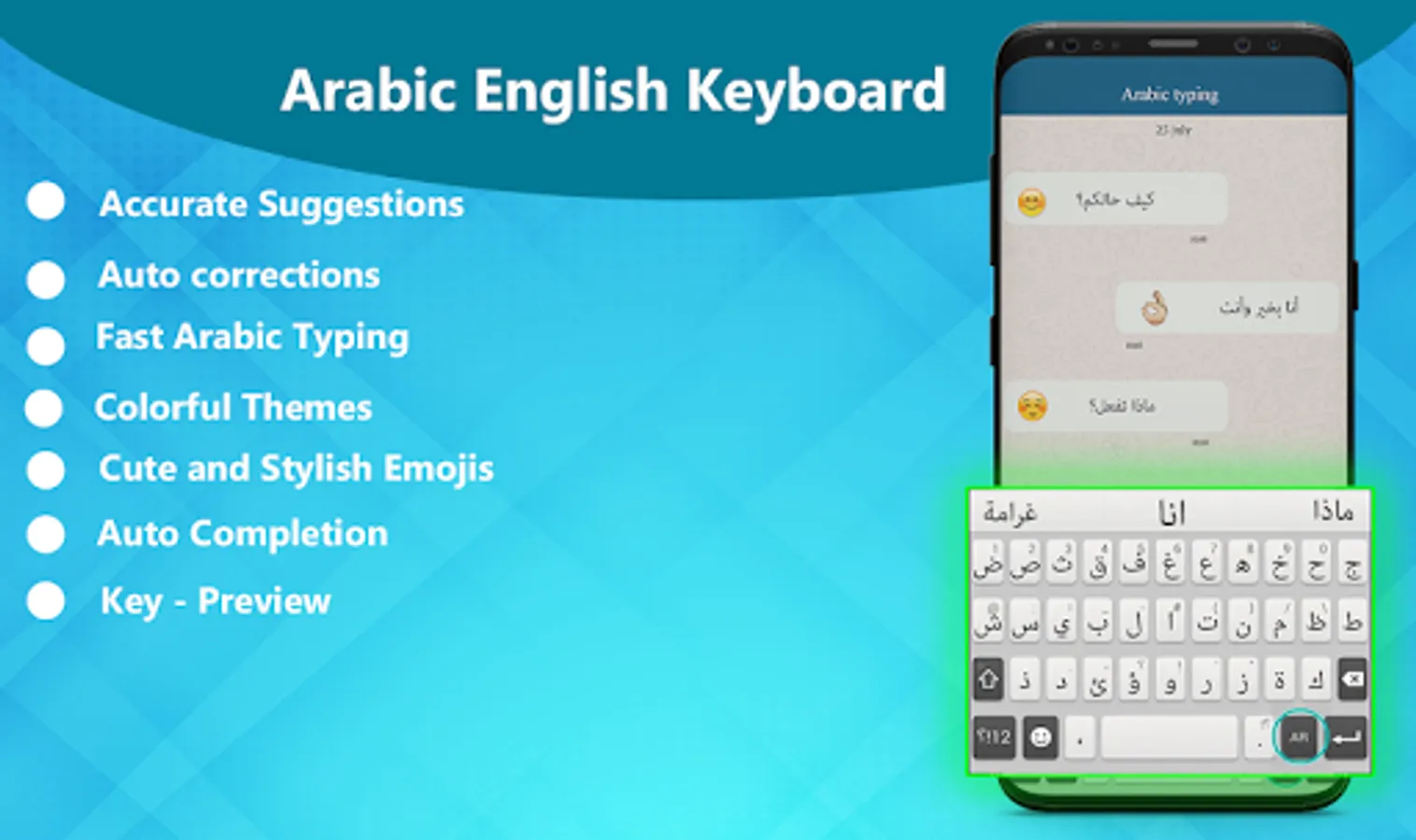 Arabic English Keyboard with emoji is here with a lot of features to make you a quick learner of the Arabic language. Arabic texting keyboard is auto text English letters keypad that helps you to type messages emails etc. Arabic typing keyboard 2021 users who want to write English to Arabic and switch Arabic to English at the same time.