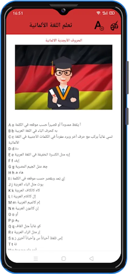 The German language teaching application displays several axes through educational lessons for beginners that help you to use German rules and to speak German fluently.