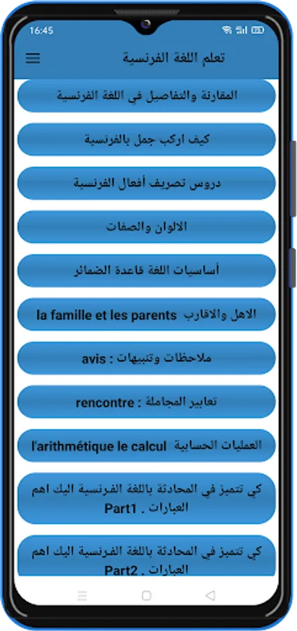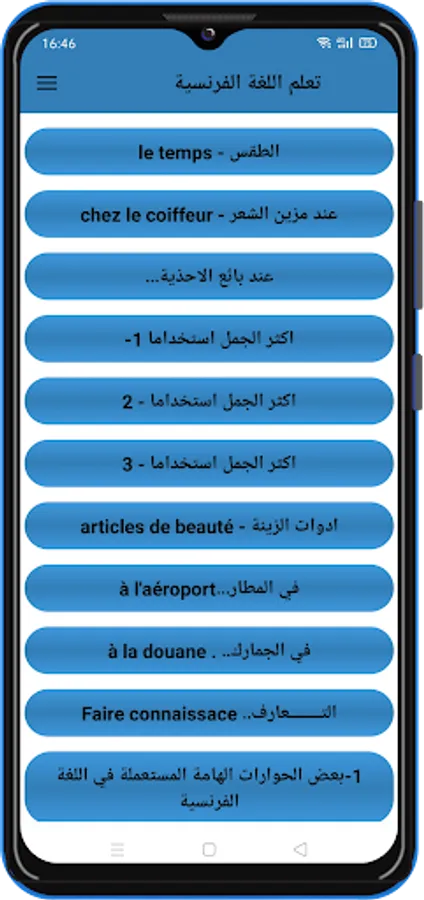 The application of learning the French language for beginners contains several sections and several different conversations according to each case to facilitate learning. It also contains simple, easy and new ways to facilitate communication in addition to the pronunciation of words; It is also intended for young and old.