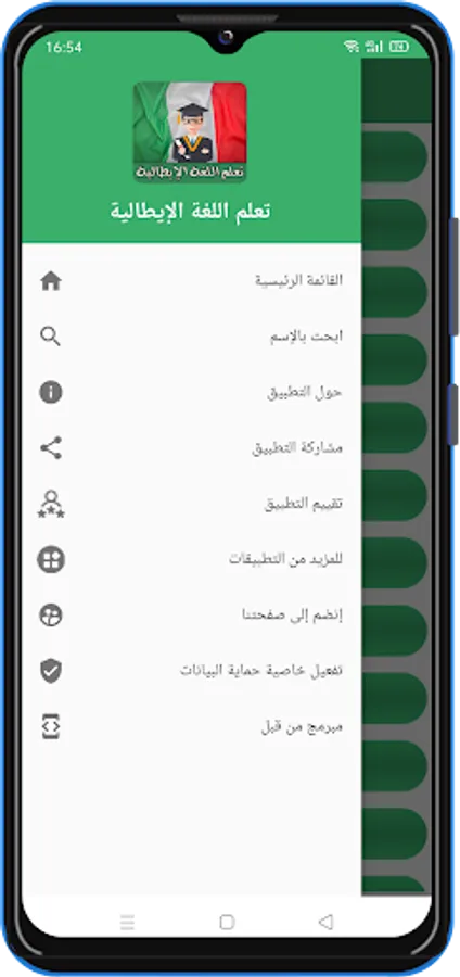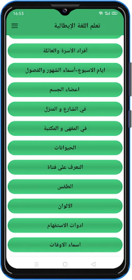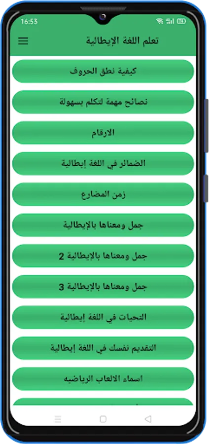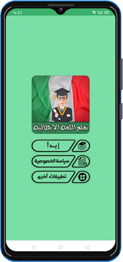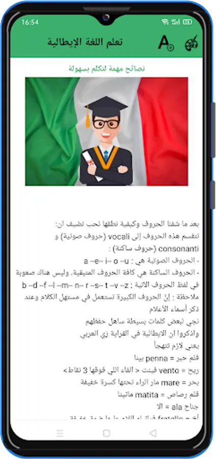 The Italian language teaching application displays several axes through educational lessons for beginners that help you use Italian rules and speak Italian fluently.