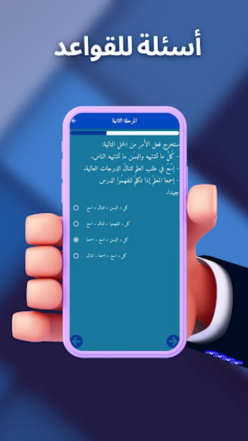 The application contains a variety of content related to grammar and syntax that will help students acquire the necessary linguistic knowledge of the authentic Arabic language. The application includes rules and questions in grammar:
