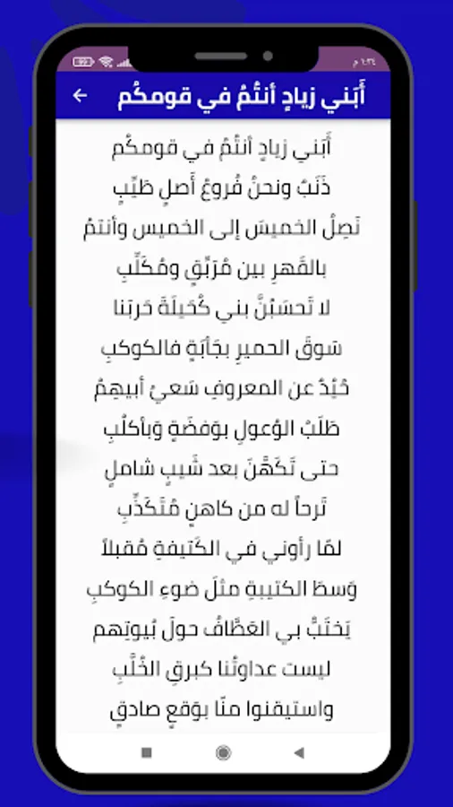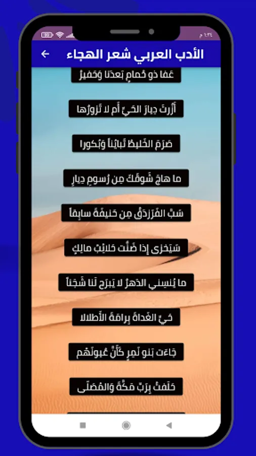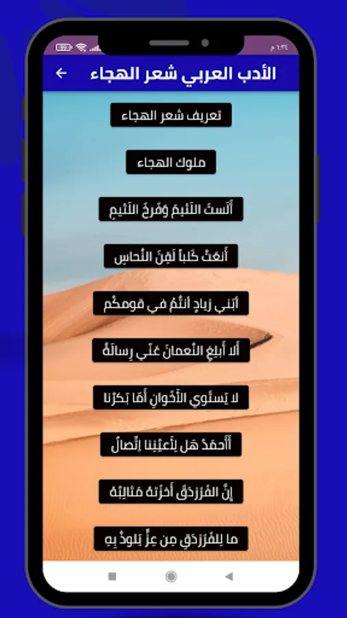 The application of Arabic literature satire poetry provides many poems of Arabic literature from the art of satire that you can easily share through our application on all social media, Snapchat, Twitter, Facebook and Instagram, and enjoy the poems with friends