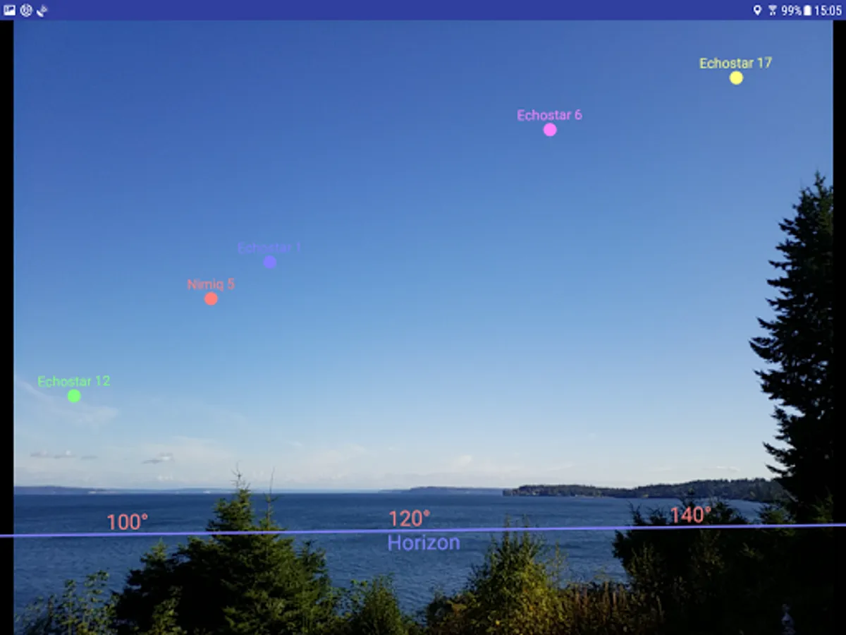 SatFinderAndroid is an advanced Android-based geostationary satellite location and dish alignment tool. It includes a database of all geostationary satellites worldwide, and it provides detailed pointing instructions for all of them. It also has a list of popular satellite receiving dish models with pointing data for them as well. And more, it has a way to superimpose the locations of your selected satellites directly on a live camera picture of the sky at your location. The picture on this page shows a typical display of four user-selected satellites, positioned on the sky in their correct locations. SatFinderAndroid also has another pointing method, meant for Android devices without cameras, that uses your Android device as an azimuth and elevation sighting tool.