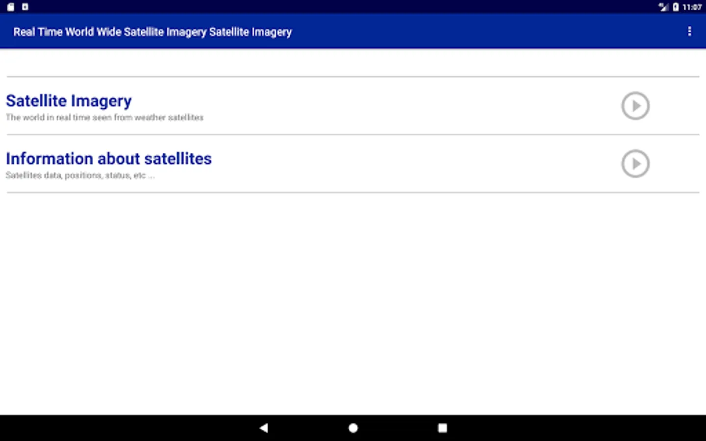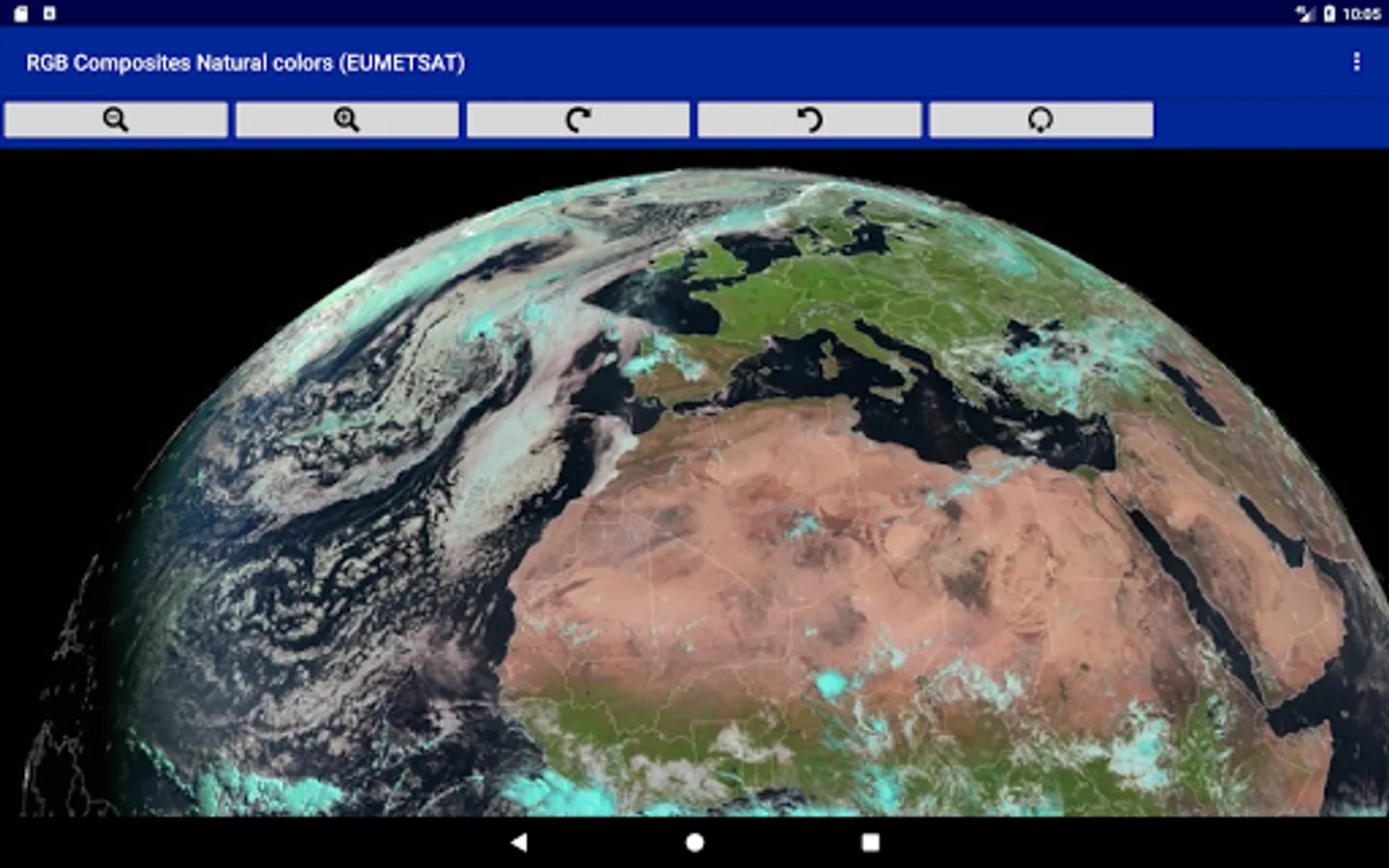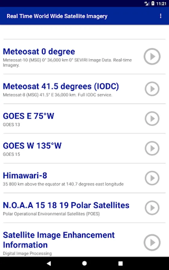 Follow the evolutions of the atmosphere in real time by displaying on your tablet or your smartphone all the images transmitted by the weather satellites of the world. Connect to Meteosat 0 ° Meteosat 41.5 ° Goes 75 ° W, Goes 135 ° W, Himawari-8, as well as the polar satellites of N.O.A.A. For each satellite you can see the whole planet or only zones in high-definition. For each view you can choice the type of image displayed: visible light, infrared of different wavelengths as well as different standards of digital processing of the images. This application manages a cache to re-display offline images. The application uses an online index to update the list of available documents without having to update the application. Enjoy the automatic addition of new views or new satellites without intervention.