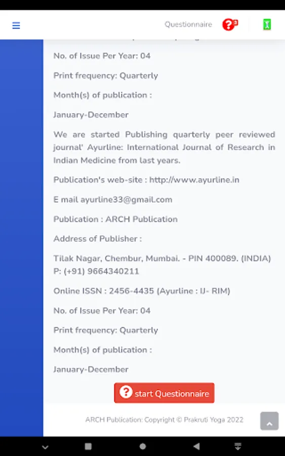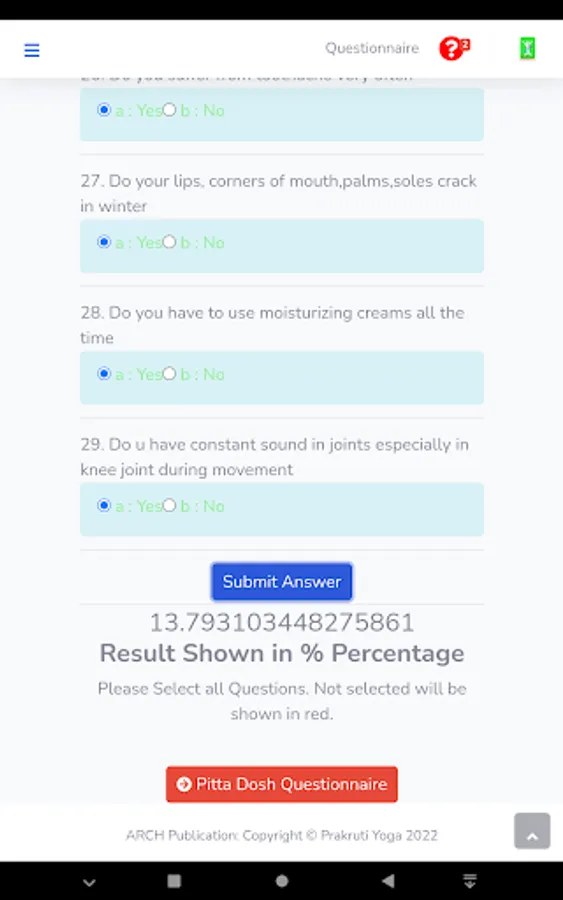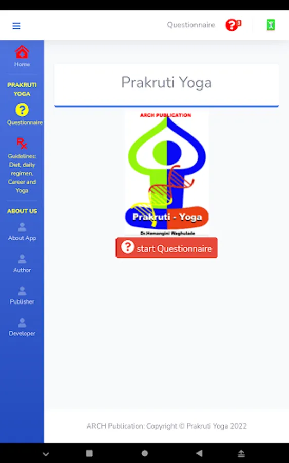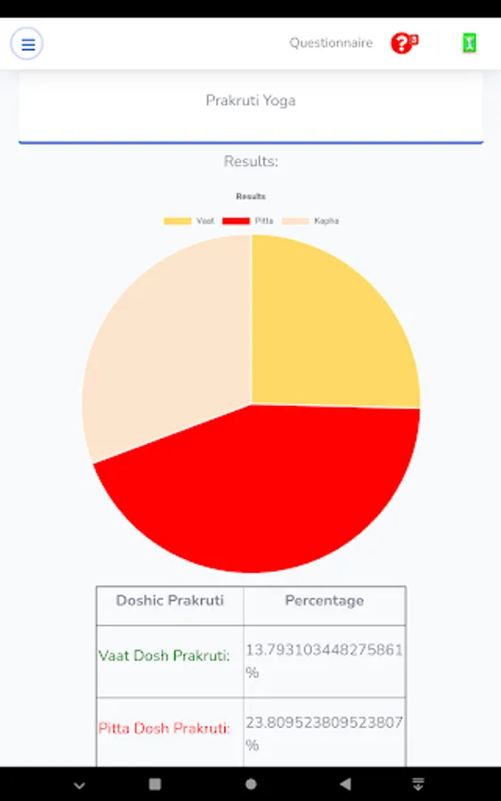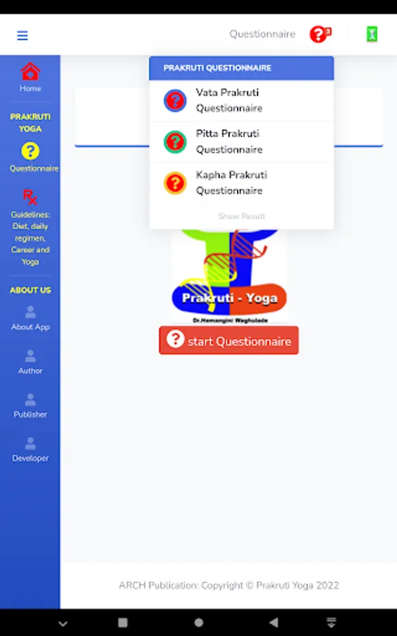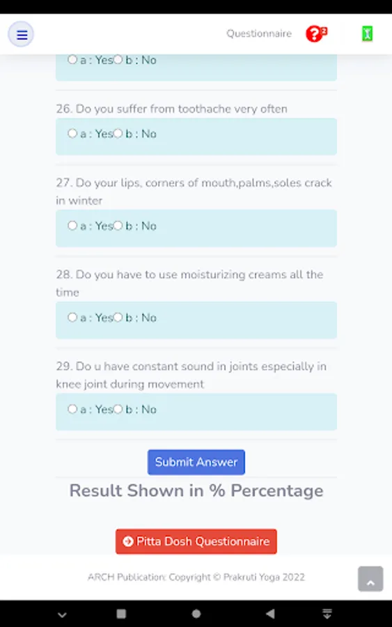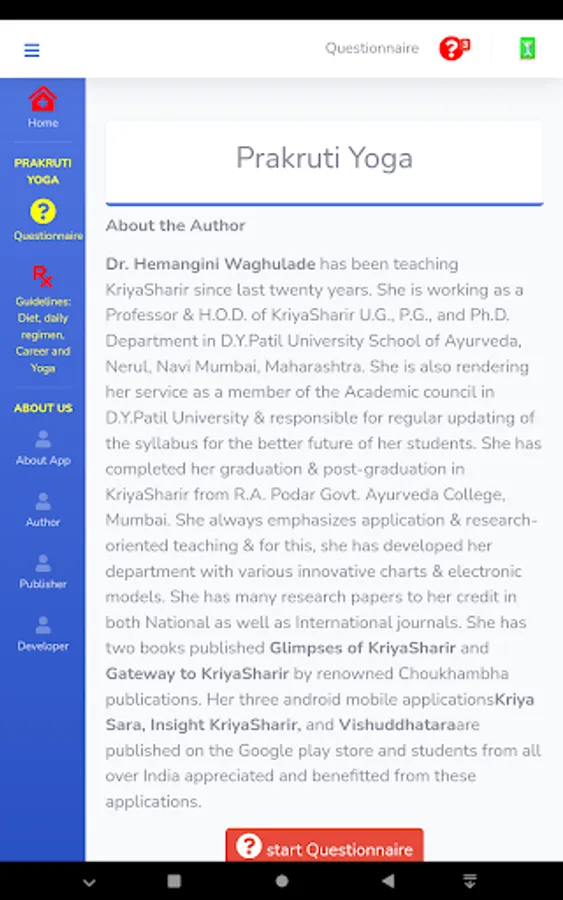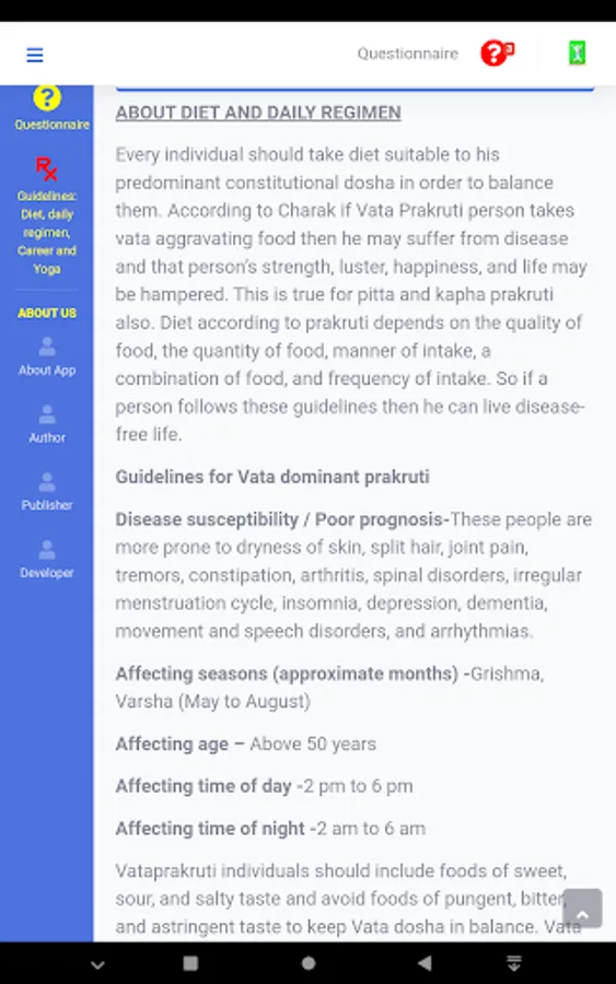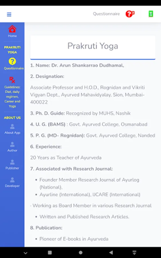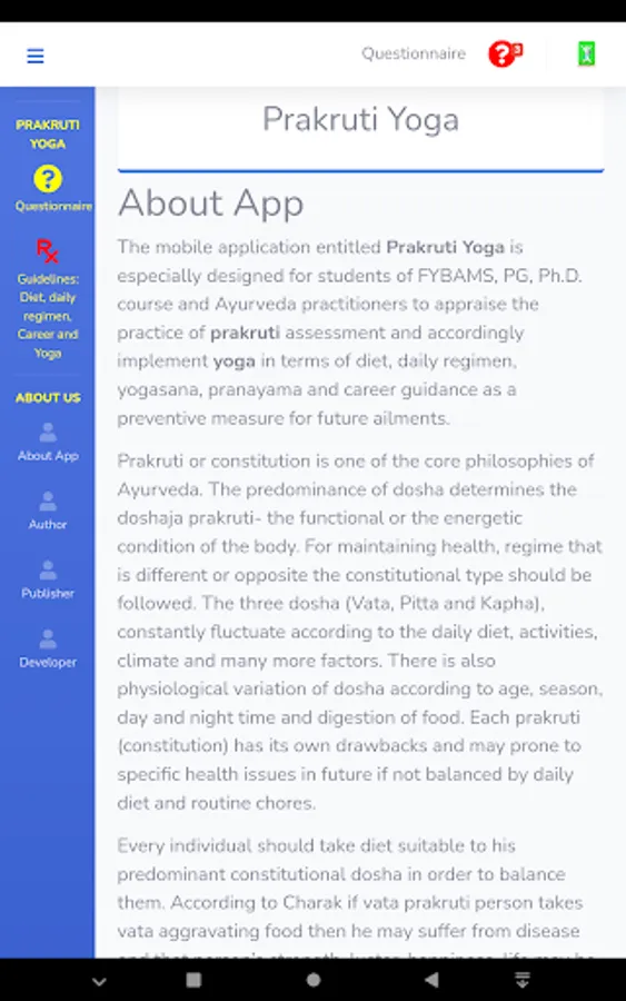 This application is a sincere effort made in the form of Questionnaires to evaluate deha prakruti considering the qualities particular dosha as given in Charak Samhita. Assessment is done according to Questionnaires and person’s response will be recorded. While answering these questions, persons are expected to assess lifelong tendency of particular habit and not temporary changes due to seasonal or diseased condition. The analysis of each dosha will be done on the basis of calculated percentage and prakruti will be decided as per the dominant dosha. Accordingly diet, daily regimen, yogasana and pranayama considering age, season, time of day and career guidance to be followed for prevention of prakruti prone diseases is suggested. This honest endeavor will be successful if you all achieve real benefit from this application.