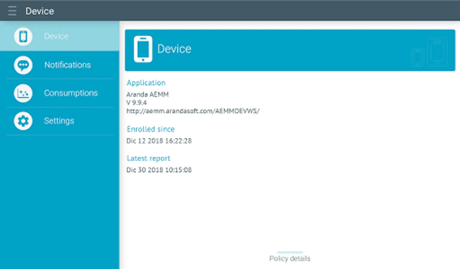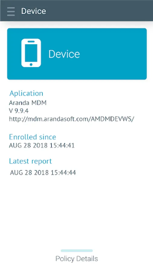 Aranda Enterprise Mobility Management agent enables Android mobile devices in your company to be secured, provisioned, monitored and remotely managed. The agent provides users with the corporate environment daily needed at work. At the same time IT managers are able to remotely manage each device’s security characteristics, update settings, monitor each device’s hardware, software and network information, prepare and enforce a device with corporate policies.
