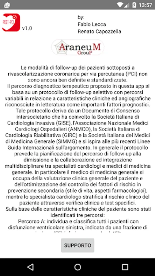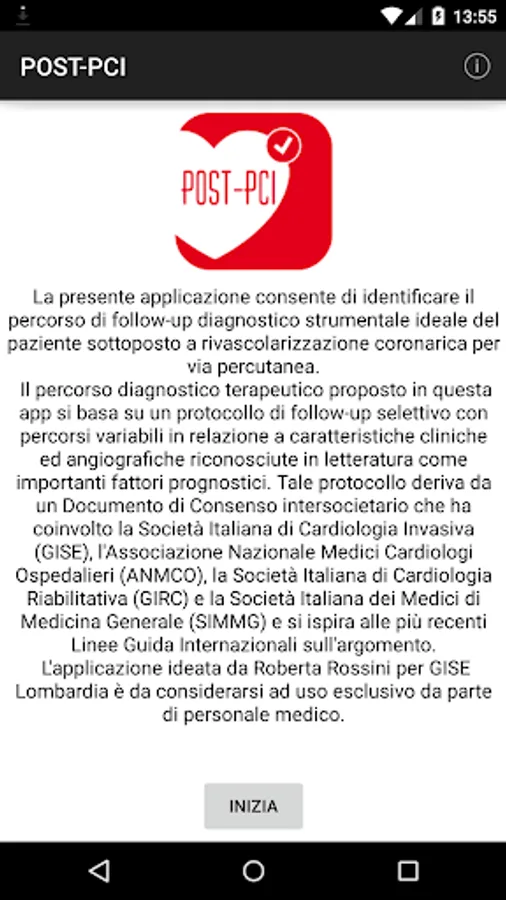 The diagnostic treatment proposed in this app is based on a protocol of follow-up with selective pathways vary according to clinical and angiographic characteristics recognized in the literature as important prognostic factors. This protocol is derived from a Consensus Statement intercompany involving the Italian Society of Invasive Cardiology (GISE), the National Association of Hospital Cardiologists (ANMCO), the Italian Society of Cardiac Rehabilitation (GIRC) and the Italian Society of Doctors of Medicine General (SIMMG) and is inspired by the most recent International Guidelines on the subject.